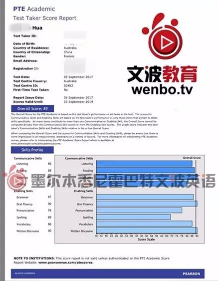 恭喜墨尔本悉尼霍巴特文波PTE学员Hua获得听力86,阅读88,口语90,写作82,总分89分的好成绩!也是九月文波PTE第32位通过四个七四个八的学员.