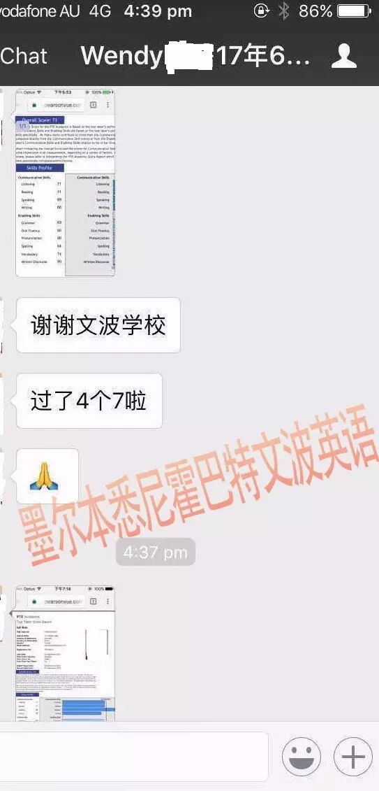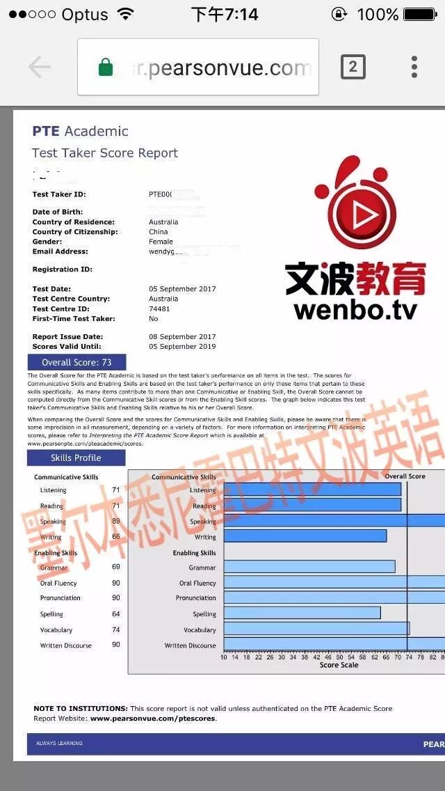 恭喜墨尔本悉尼霍巴特文波PTE学员Wendy获得听力71,阅读71,口语89,写作66,总分73分的好成绩!也是九月文波PTE第37位通过四个七四个八的学员.