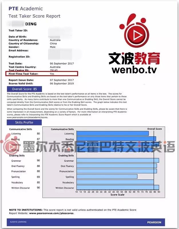 恭喜墨尔本悉尼霍巴特文波PTE学员Jeffery获得听力80,阅读87,口语90,写作84,总分85分的好成绩!也是九月文波PTE第33位通过四个七四个八的学员.