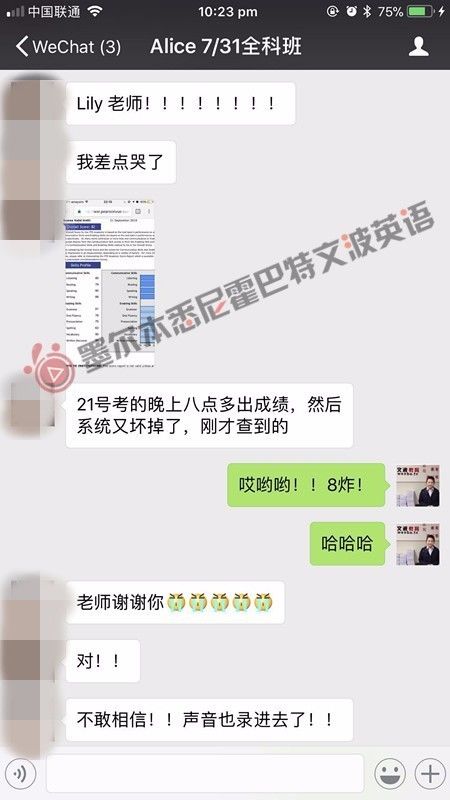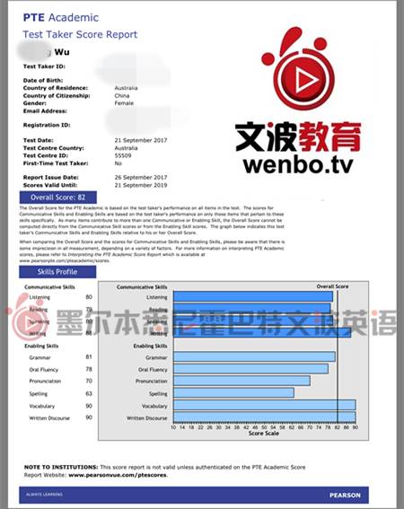 恭喜墨尔本悉尼霍巴特文波PTE学员Alice获得听力80,阅读79,口语80,写作88,总分82分的好成绩!也是九月文波PTE第99位通过四个七四个八的学员.
