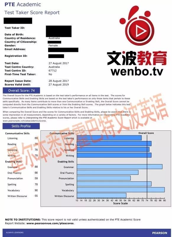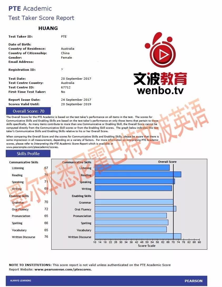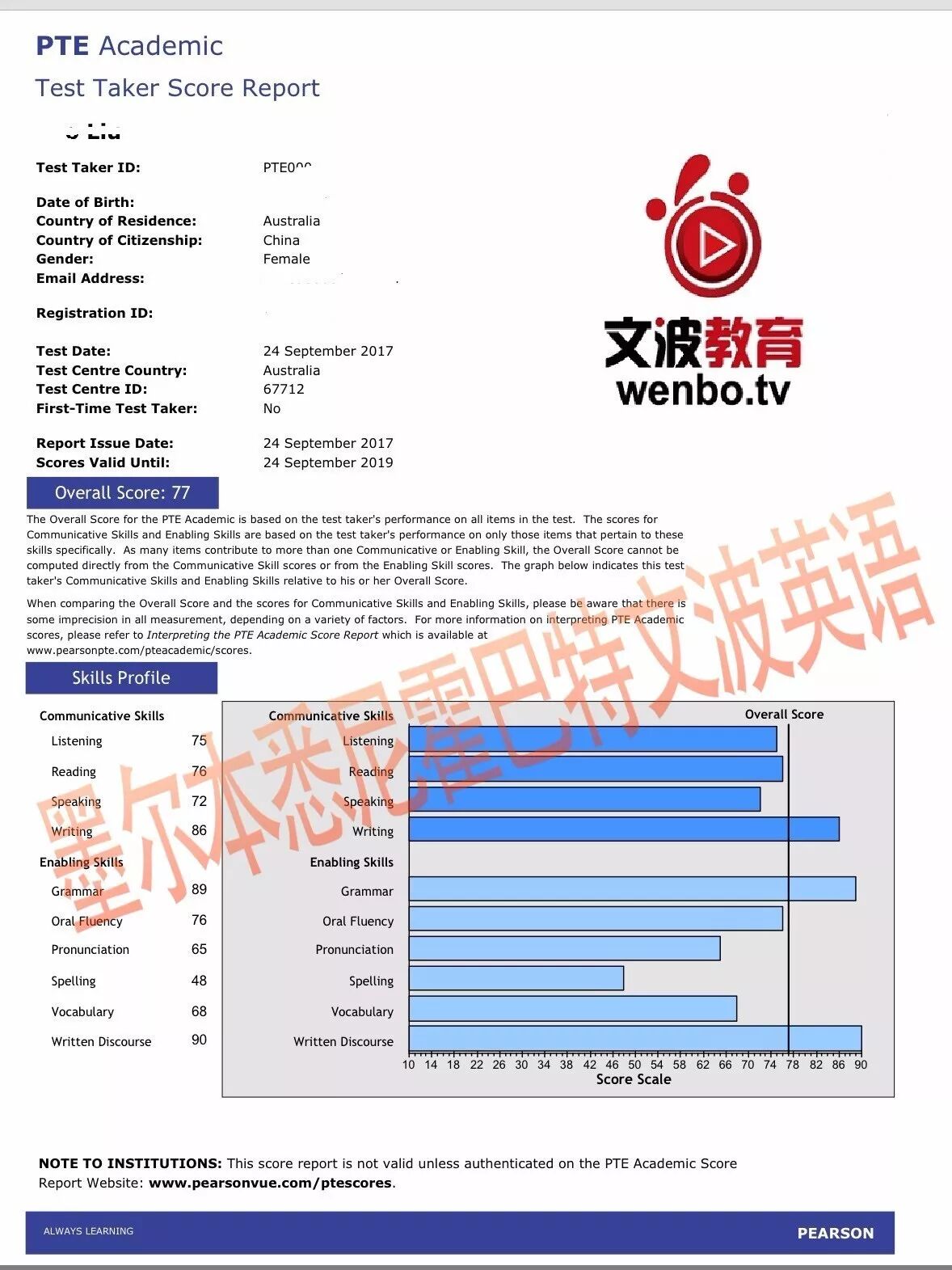 恭喜墨尔本悉尼霍巴特文波PTE学员Tam获得听力69,阅读78,口语76,写作78,总分74分的好成绩!也是九月文波PTE第97位通过四个七四个八的学员.