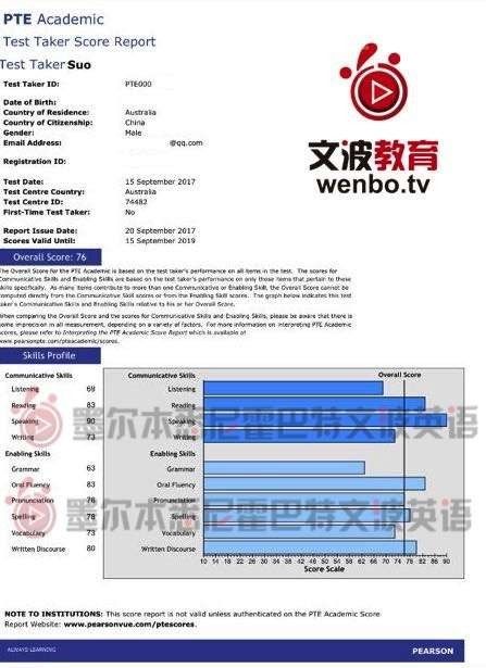 恭喜墨尔本悉尼霍巴特文波PTE学员Yang获得听力69,阅读83,口语90,写作73,总分76分的好成绩!也是九月文波PTE第95位通过四个七四个八的学员.