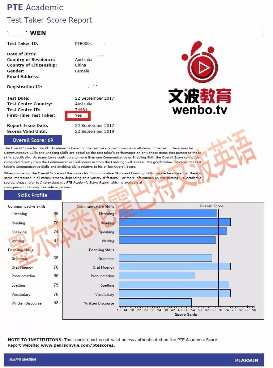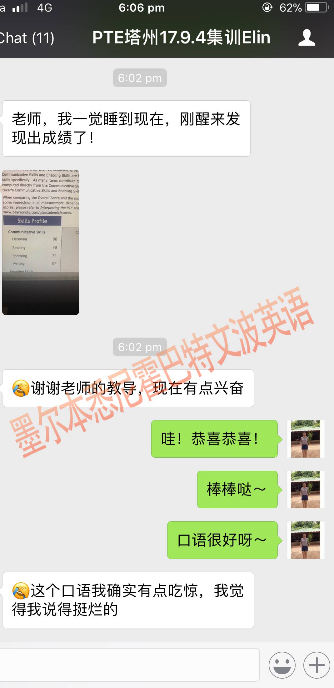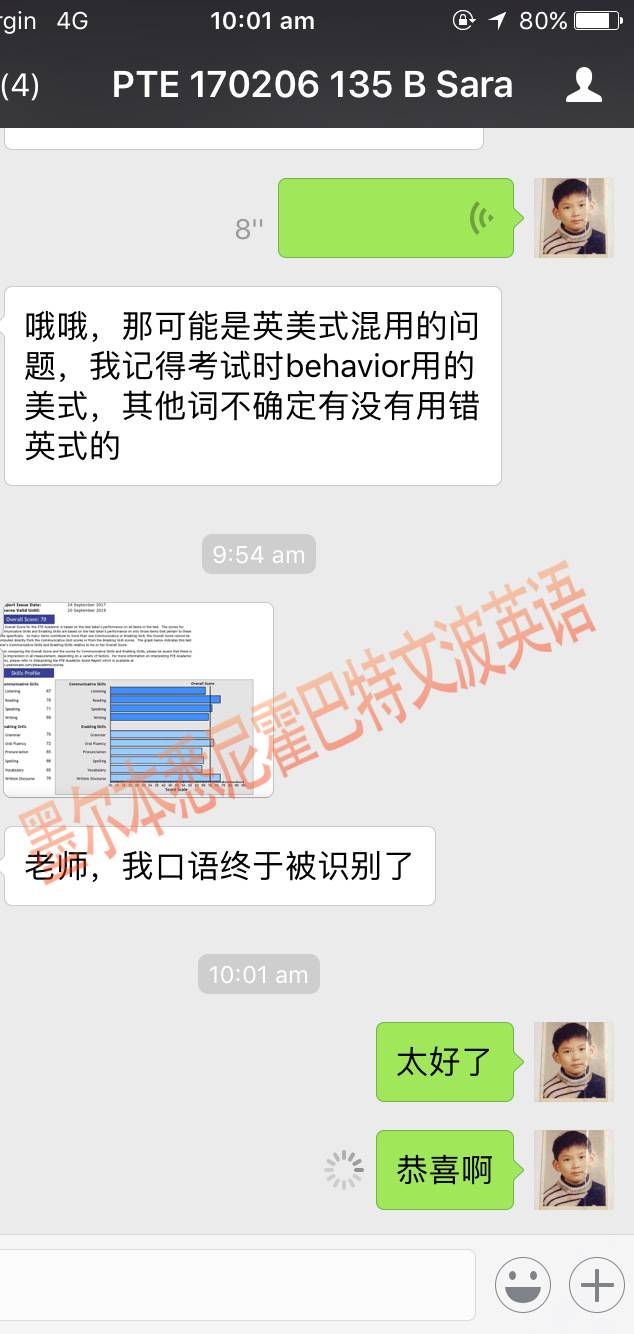 恭喜墨尔本悉尼霍巴特文波PTE学员Elin获得听力68,阅读76,口语74,写作67,总分69分的好成绩!也是九月文波PTE第93位通过四个七四个八的学员.