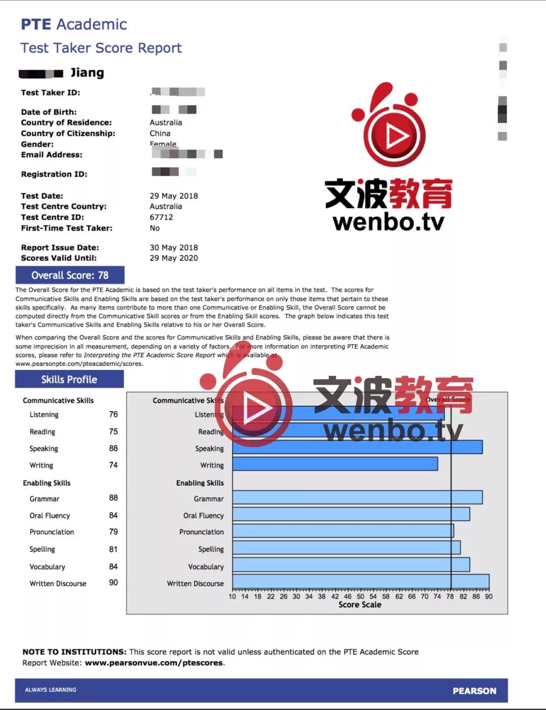恭喜墨尔本悉尼霍巴特阿德莱德文波PTE学员Jocelyn同学获得听力76 ,阅读75,口语88,写作74,总分78的好成绩!也是五月文波PTE第62位通过四个七四个八的学员。