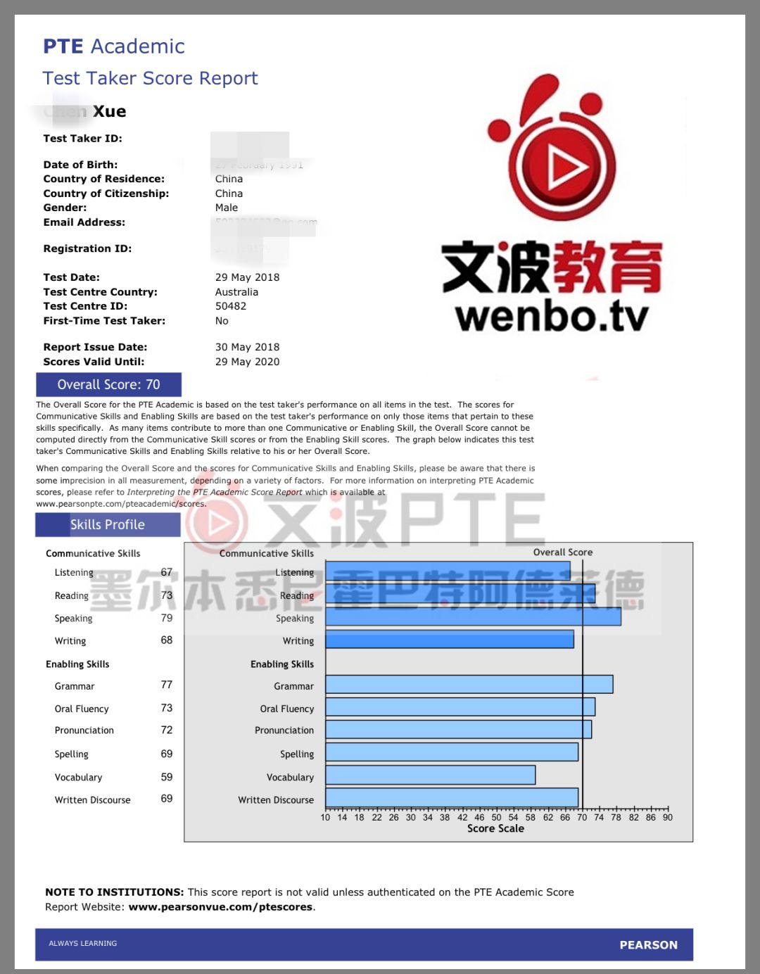 恭喜墨尔本悉尼霍巴特阿德莱德文波PTE学员Ben同学获得听力67,阅读73,口语79,写作68,总分70分的好成绩!也是五月文波PTE第65位通过四个七四个八的学员。