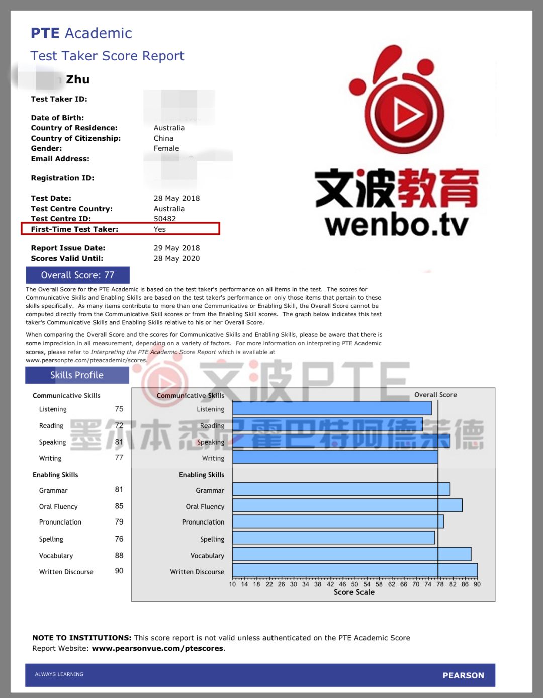 恭喜墨尔本悉尼霍巴特阿德莱德文波PTE学员Anne同学获得听力75,阅读72,口语81,写作77,总分77分的好成绩!也是五月文波PTE第63位通过四个七四个八的学员。