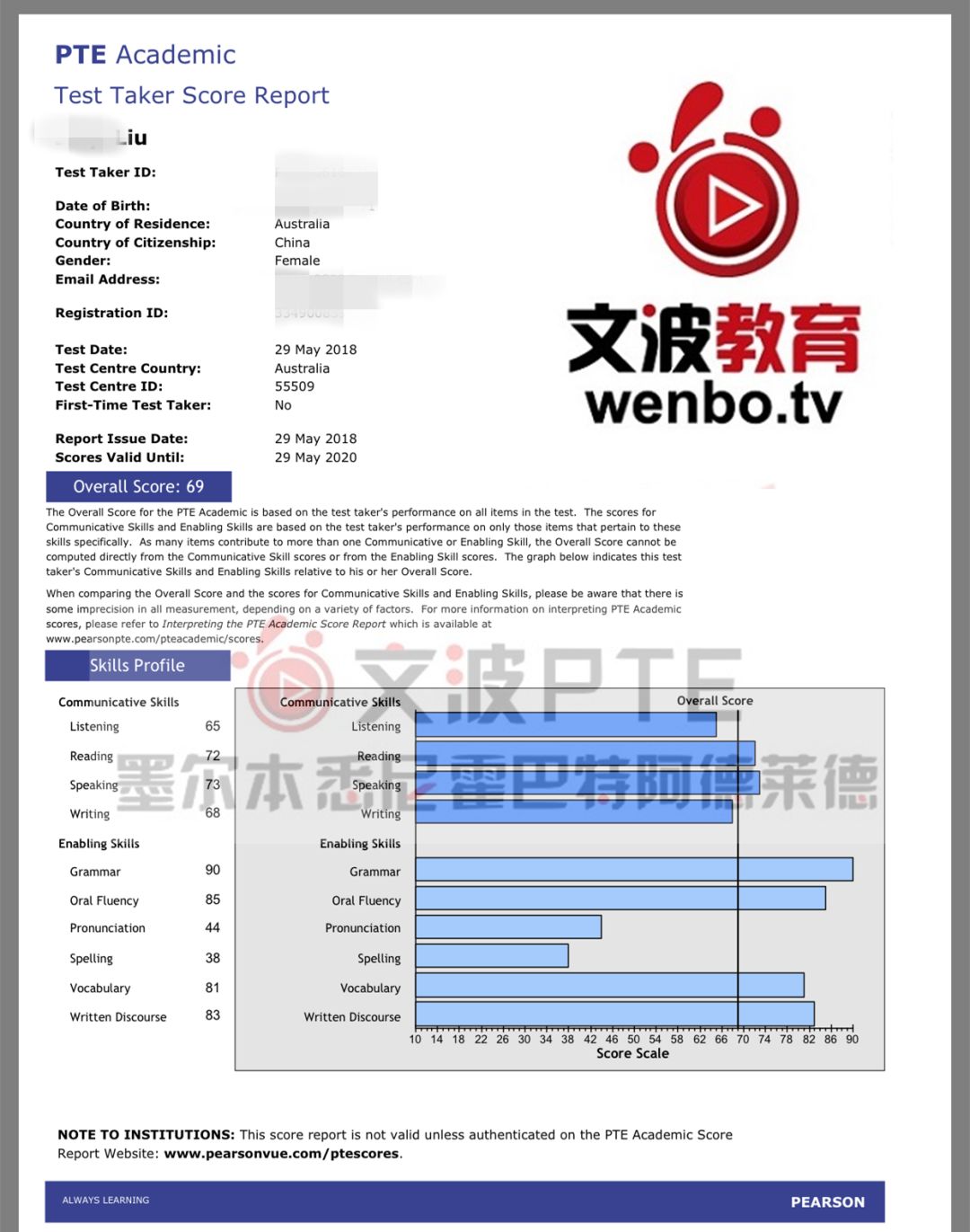 恭喜墨尔本悉尼霍巴特阿德莱德文波PTE学员Jane同学获得听力65,阅读72,口语73,写作68,总分69分的好成绩!也是五月文波PTE第64位通过四个七四个八的学员。