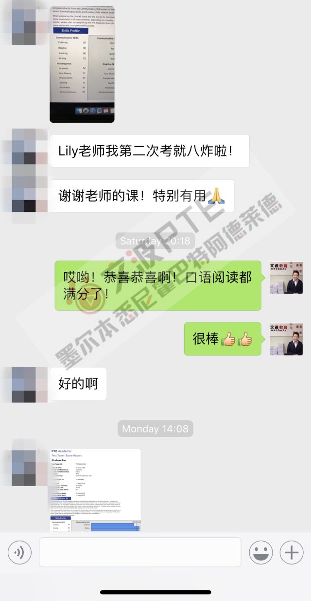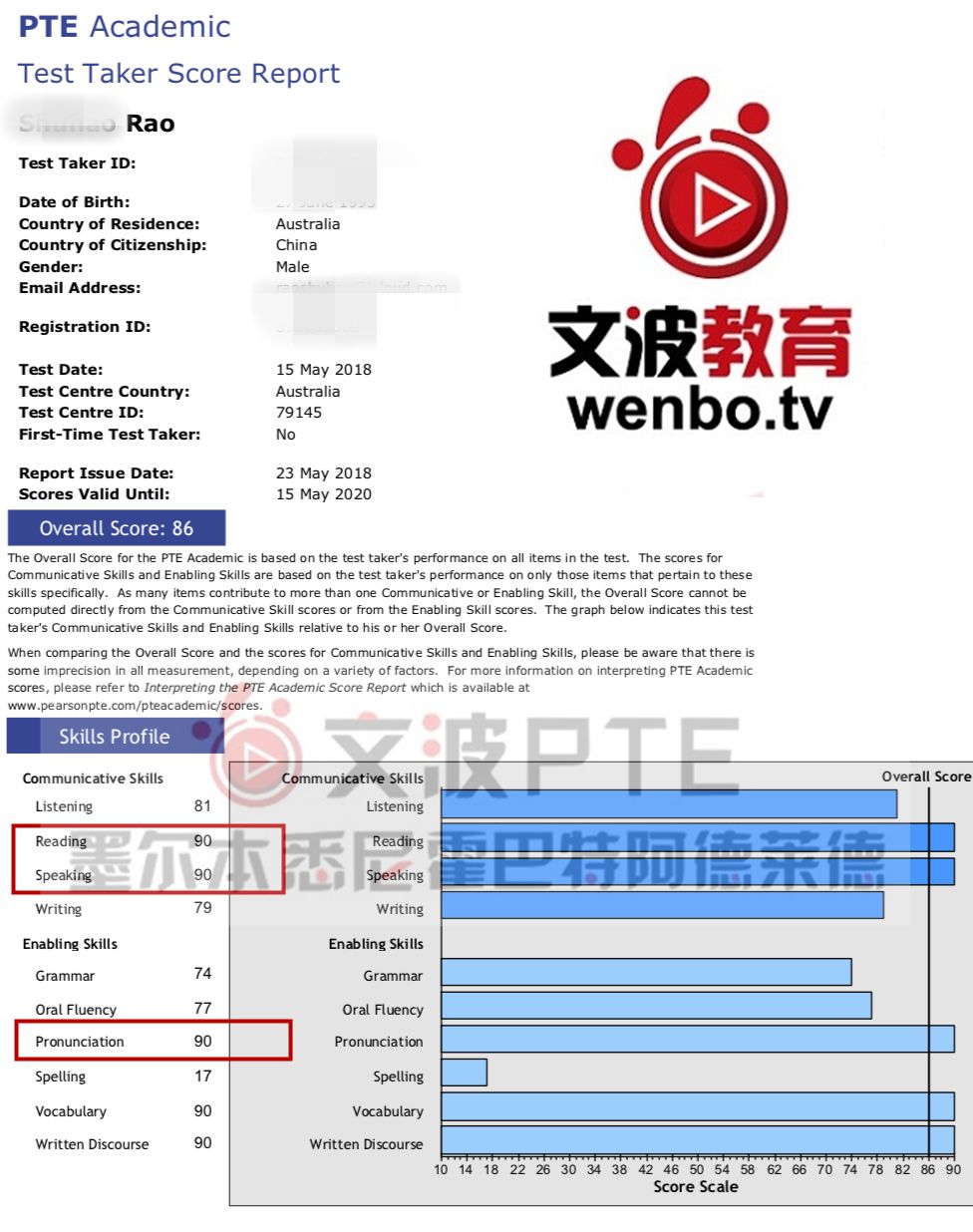 恭喜墨尔本悉尼霍巴特阿德莱德文波PTE学员Rao同学获得听力81,阅读90,口语90,写作79,总分86分的好成绩!也是五月文波PTE第61位通过四个七四个八的学员。
