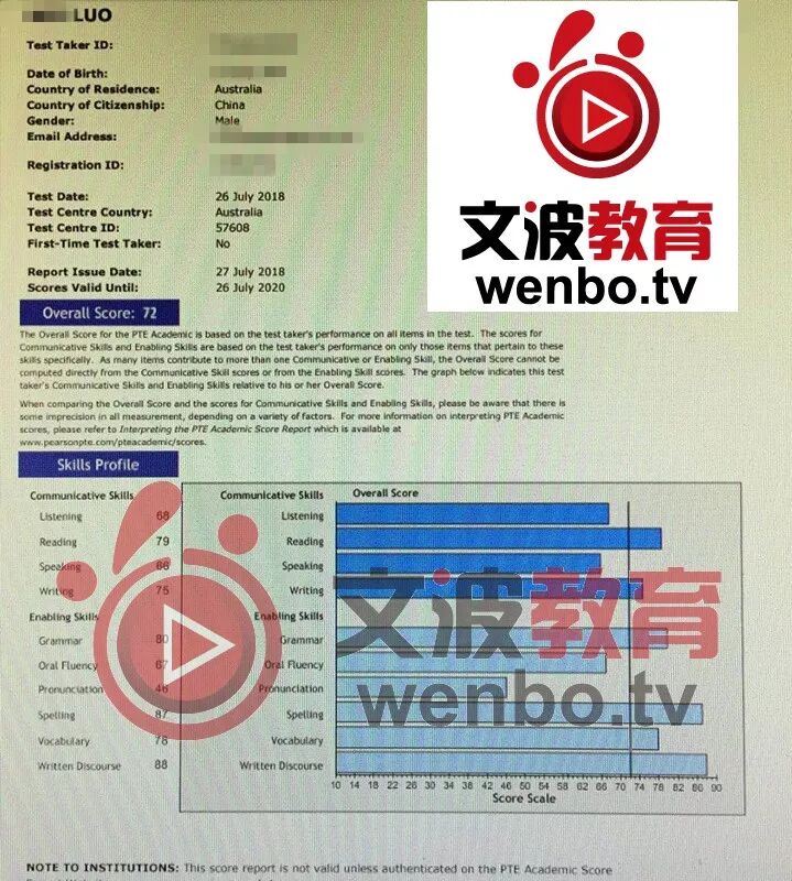 恭喜墨尔本悉尼霍巴特阿德莱德文波PTE学员Luo同学获得听力68,阅读79,口语66,写作75,总分72的好成绩!也是8月文波PTE第32位通过四个七四个八的学员