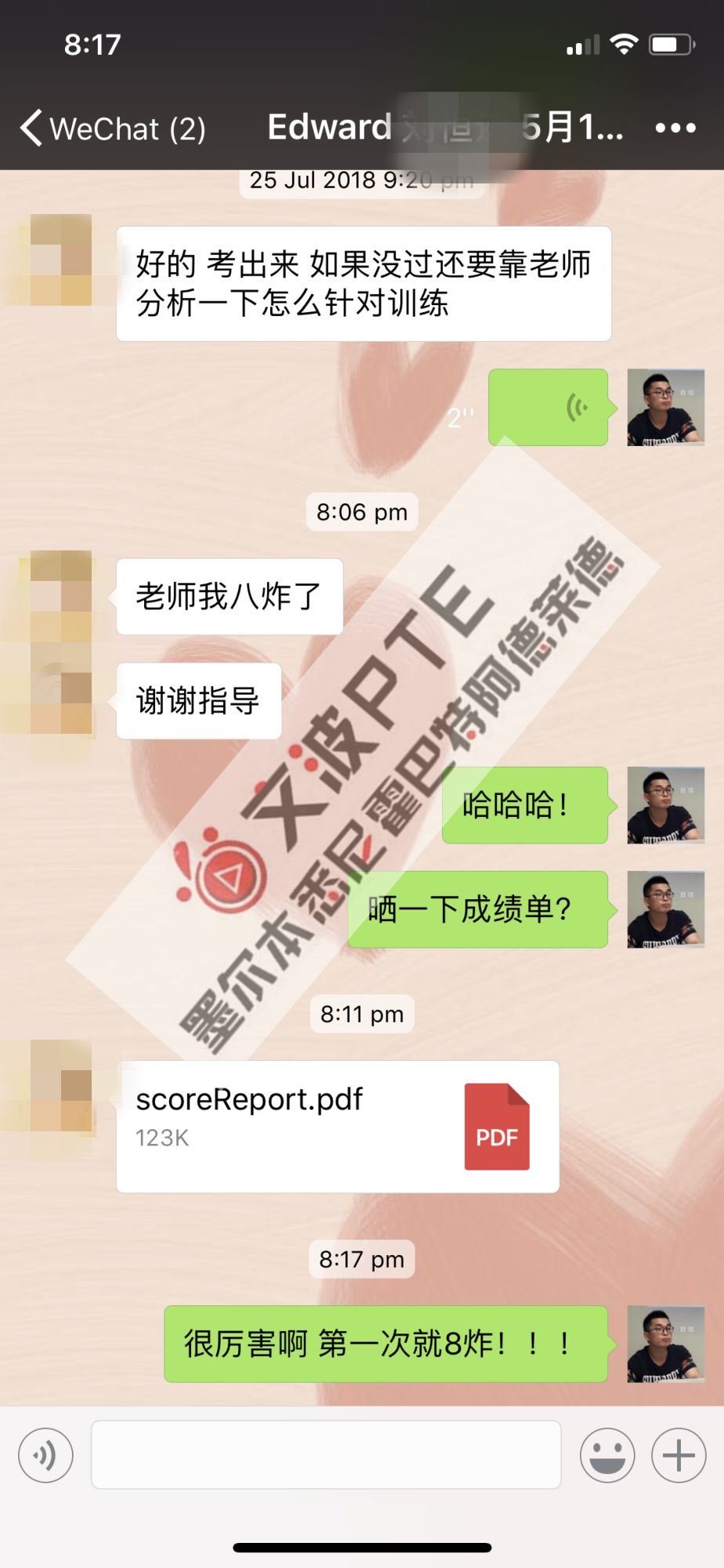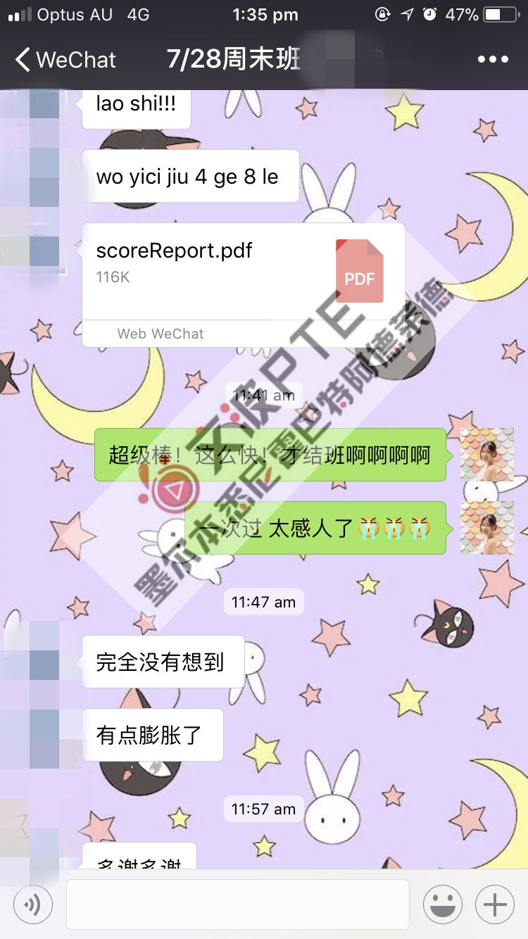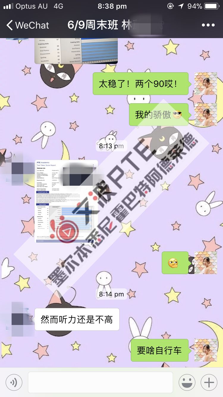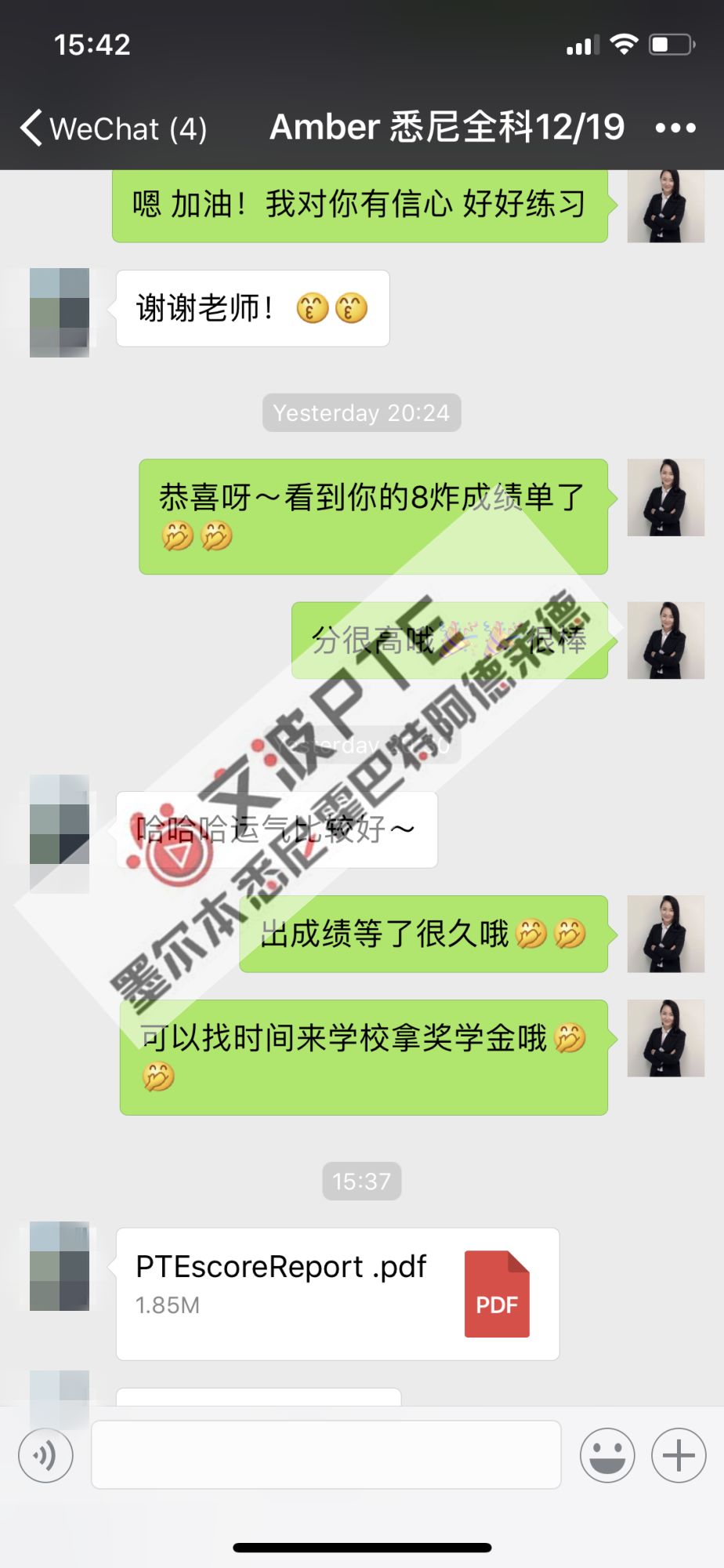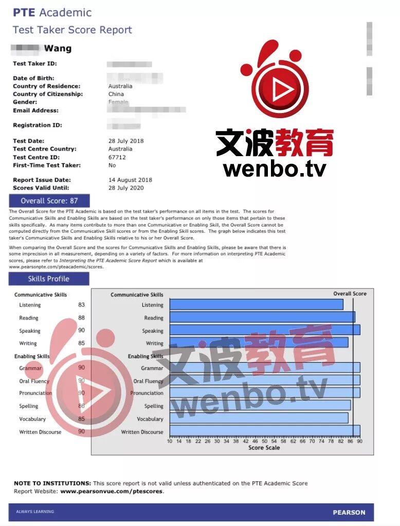 恭喜墨尔本悉尼霍巴特阿德莱德文波PTE学员Wang同学获得听力83,阅读88,口语90,写作85,总分87的好成绩!也是8月文波PTE第31位通过四个七四个八的学员