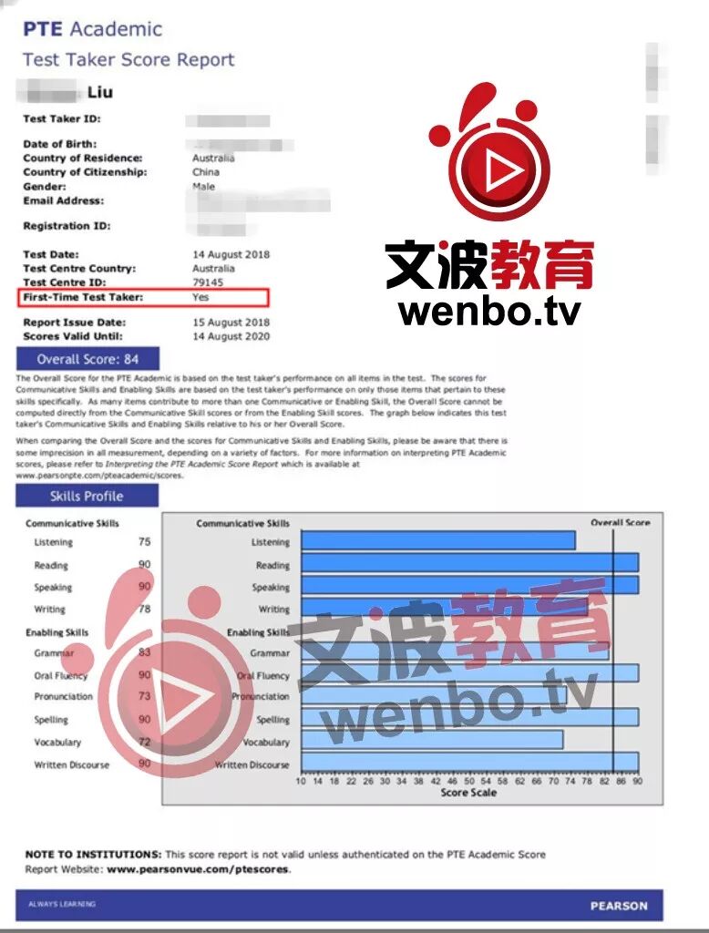 恭喜墨尔本悉尼霍巴特阿德莱德文波PTE学员Liu同学获得听力75,阅读90,口语90,写作78,总分84的好成绩!也是8月文波PTE第33位通过四个七四个八的学员