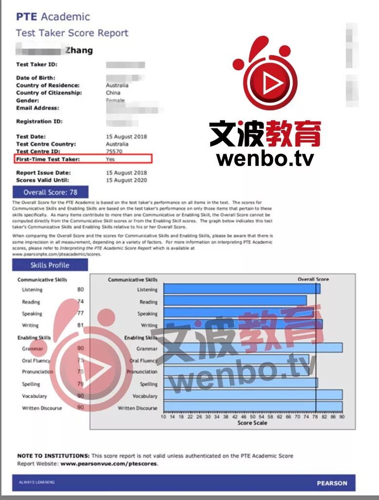 恭喜墨尔本悉尼霍巴特阿德莱德文波PTE学员Zhang同学获得听力80,阅读74,口语77,写作81,总分78的好成绩!也是8月文波PTE第34位通过四个七四个八的学员