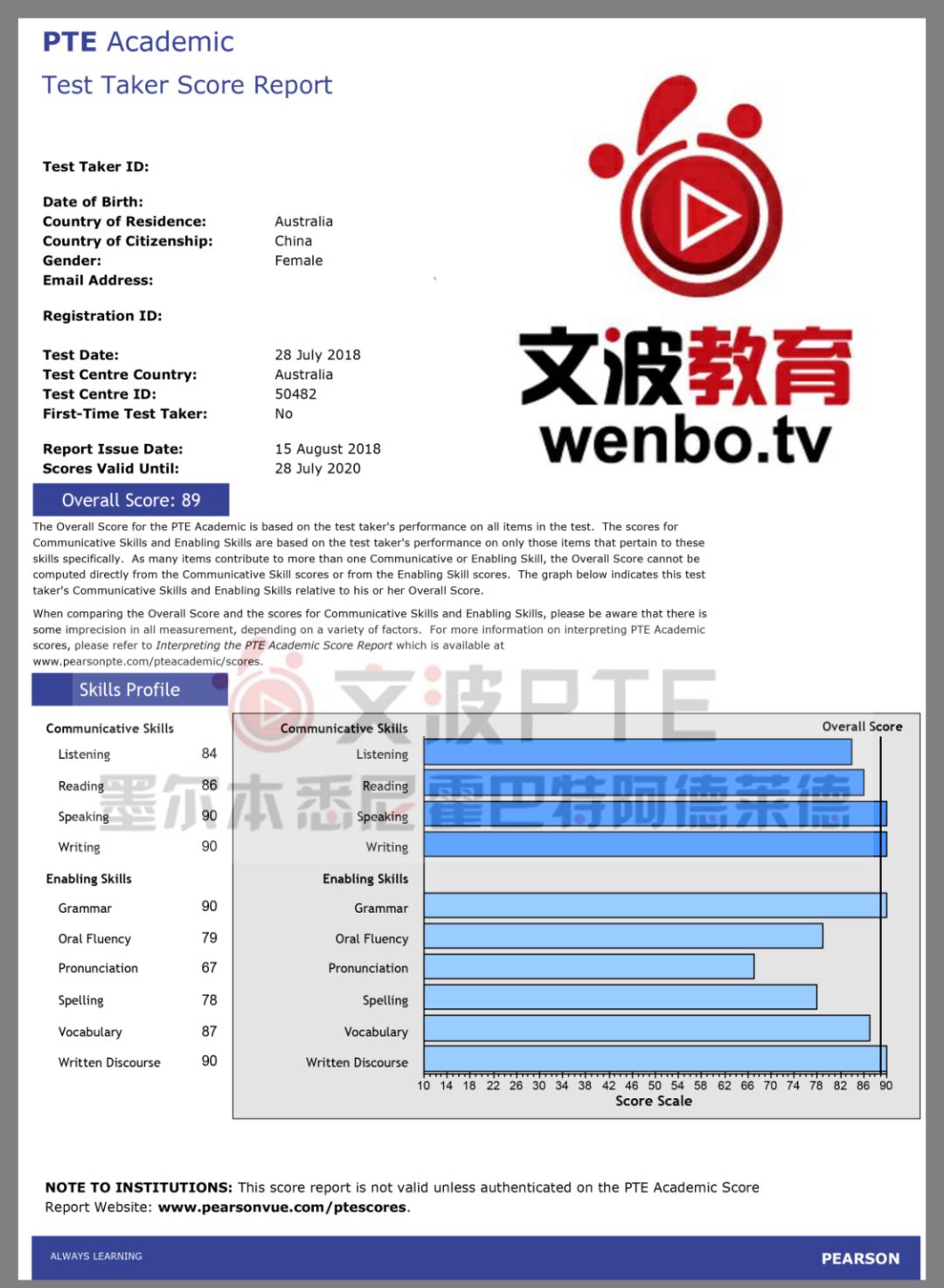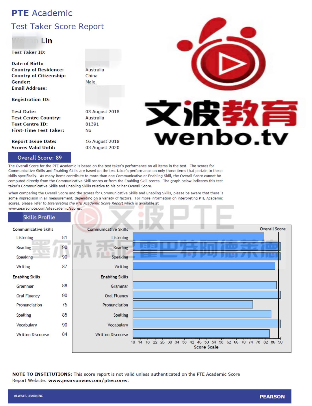 恭喜墨尔本悉尼霍巴特阿德莱德文波PTE学员Lin同学获得听力81,阅读90,口语90,写作87,总分89的好成绩!也是8月文波PTE第39位通过四个七四个八的学员