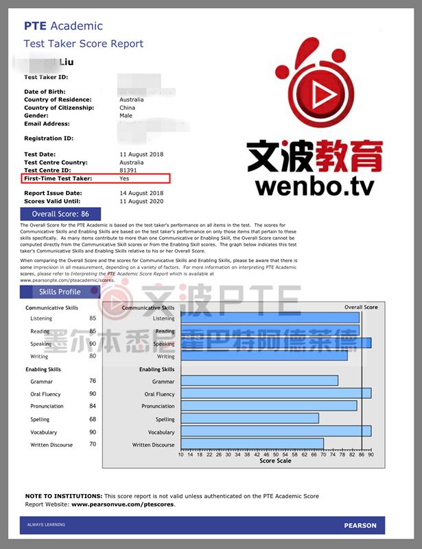 恭喜墨尔本悉尼霍巴特阿德莱德文波PTE学员Liu同学获得听力85,阅读85,口语90,写作80,总分86的好成绩!也是8月文波PTE第36位通过四个七四个八的学员
