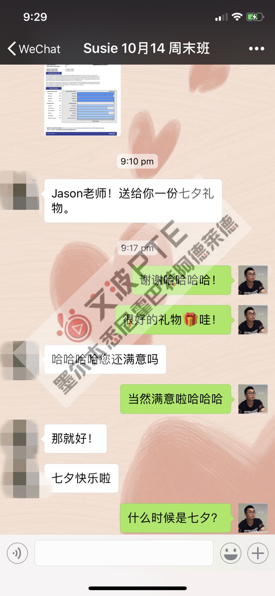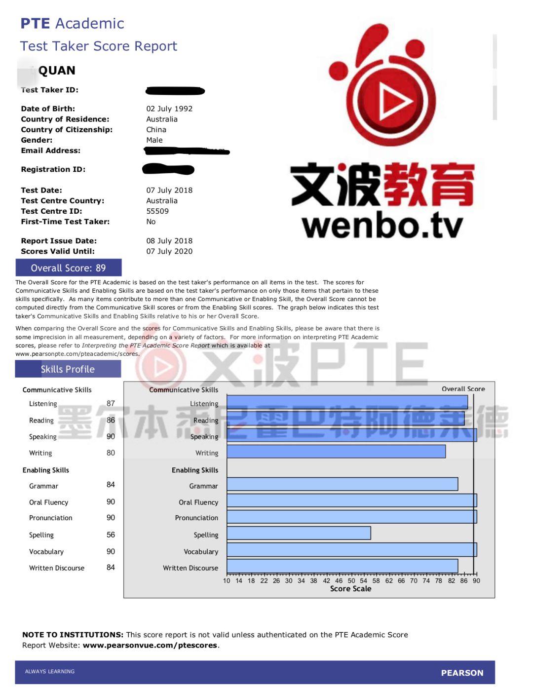 恭喜墨尔本悉尼霍巴特阿德莱德文波PTE学员Quan同学获得听力87,阅读86,口语90,写作80,总分89的好成绩!也是8月文波PTE第40位通过四个七四个八的学员