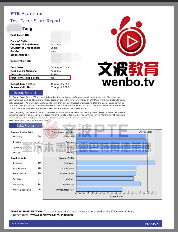 恭喜墨尔本悉尼霍巴特阿德莱德文波PTE学员Tong同学获得听力80,阅读81,口语82,写作81,总分81的好成绩!也是8月文波PTE第37位通过四个七四个八的学员