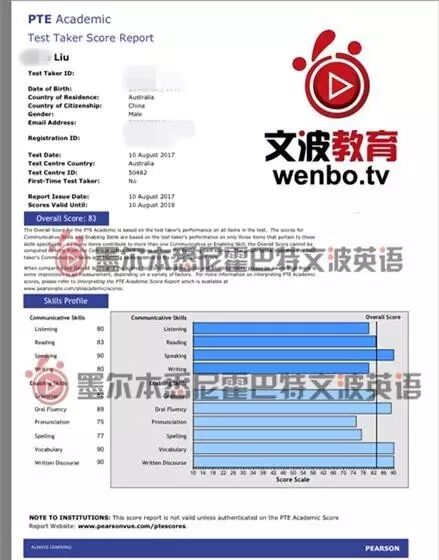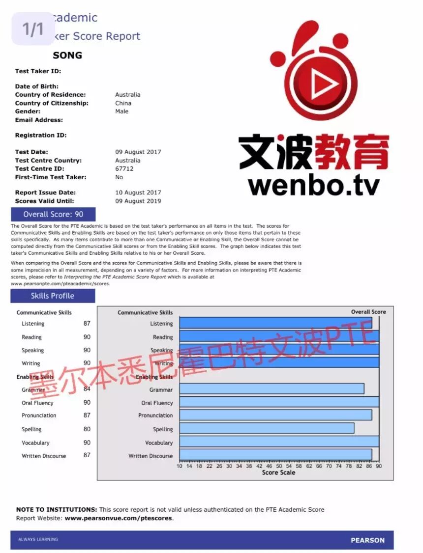 恭喜墨尔本悉尼文波PTE学员Song获得听力87,阅读90,口语90,写作90,总分90分的好成绩!也是八月文波PTE第36位通过四个七四个八的学员.