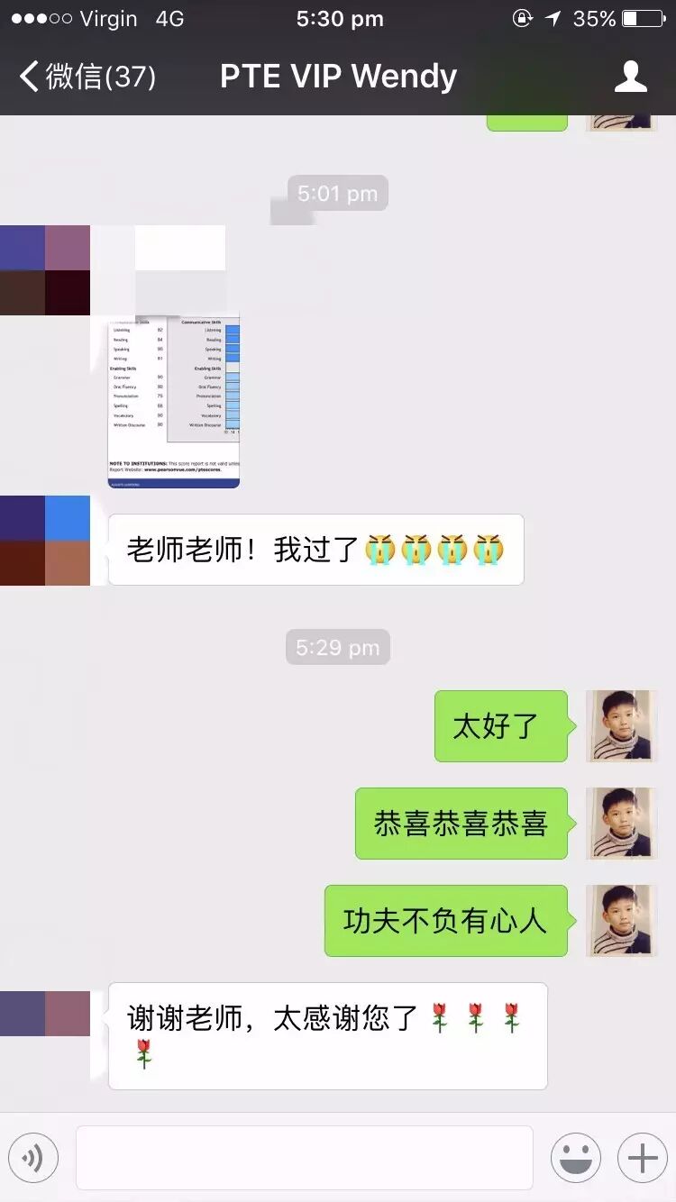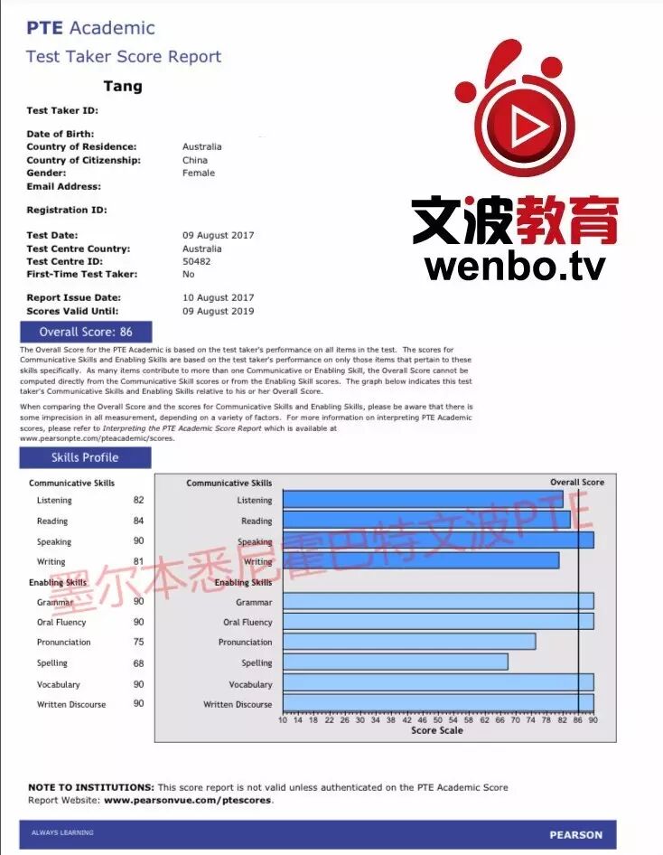 恭喜墨尔本悉尼文波PTE学员Wendy获得听力82,阅读84,口语90,写作81,总分86分的好成绩!也是八月文波PTE第37位通过四个七四个八的学员.