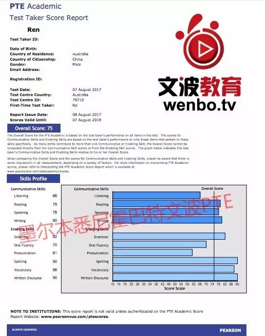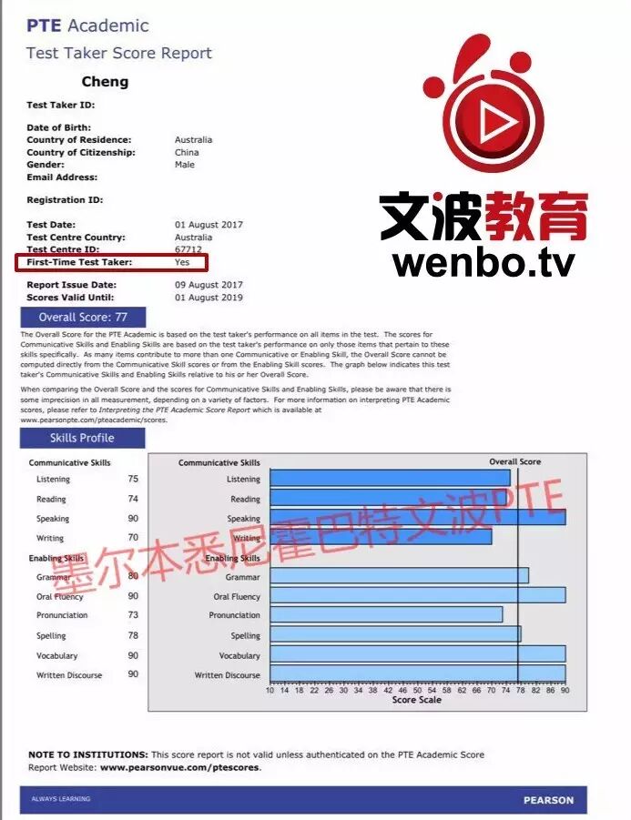 恭喜墨尔本悉尼文波PTE学员Ren获得听力66,阅读79,口语78,写作80,总分75分的好成绩!也是八月文波PTE第32位通过四个七四个八的学员.