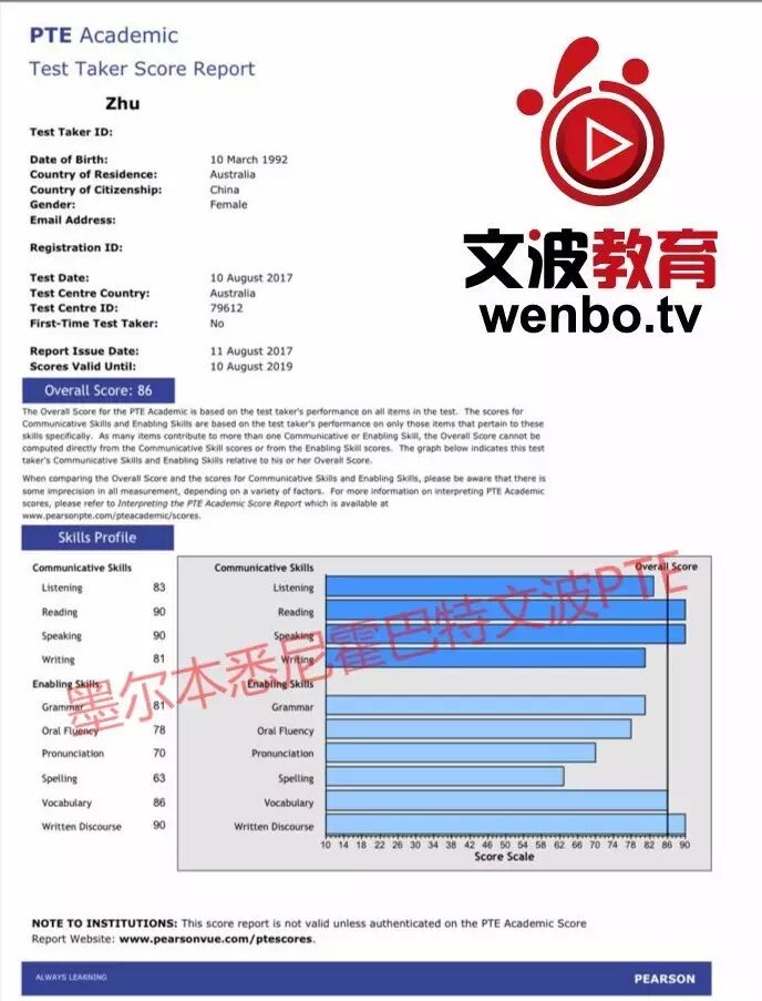 喜墨尔本悉尼文波PTE学员June获得听力83,阅读90,口语90,写作81,总分86分的好成绩!也是八月文波PTE第39位通过四个七四个八的学员.