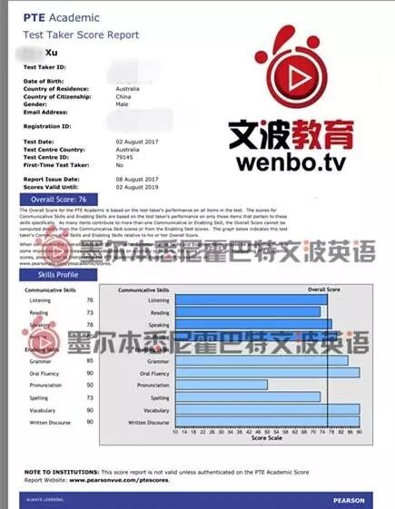恭喜墨尔本悉尼文波PTE学员Xu获得听力76,阅读73,口语78,写作80,总分76分的好成绩!也是八月文波PTE第35位通过四个七四个八的学员.