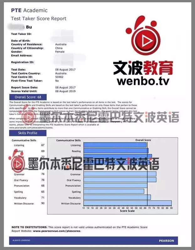 恭喜墨尔本悉尼文波PTE学员Yuan获得听力72,阅读65,口语66,写作73,总分68分的好成绩!也是八月文波PTE第33位通过四个七四个八的学员.