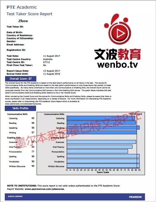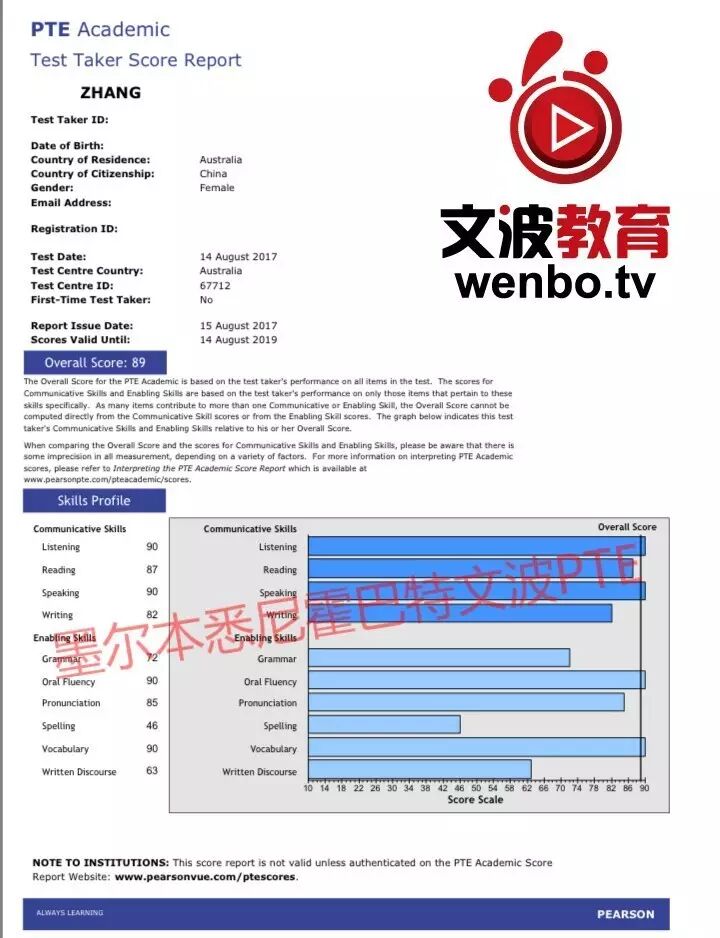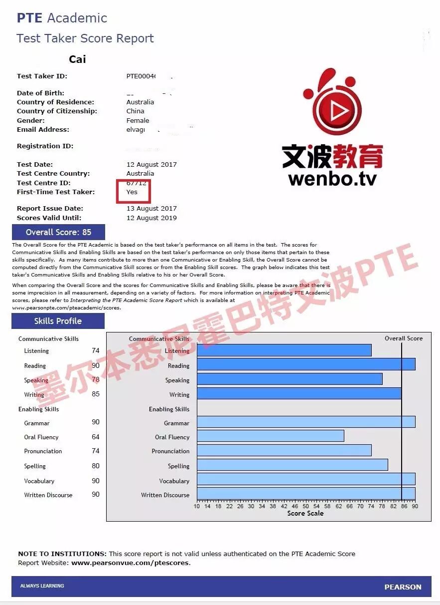 喜墨尔本悉尼文波PTE学员Cai获得听力74,阅读90,口语78,写作85,总分85分的好成绩!也是八月文波PTE第44位通过四个七四个八的学员.