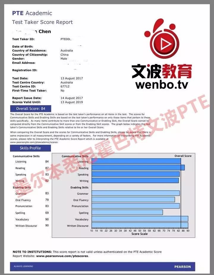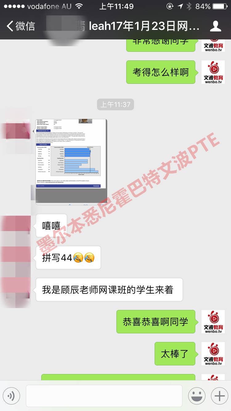 恭喜墨尔本悉尼文波PTE学员Roy获得听力84,阅读87,口语83,写作82,总分84分的好成绩!也是八月文波PTE第43位通过四个七四个八的学员.
