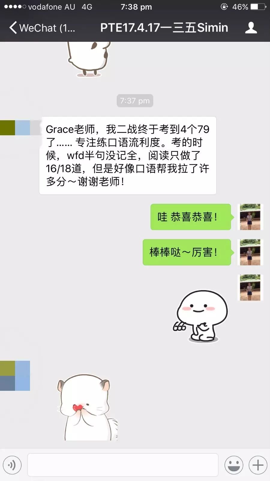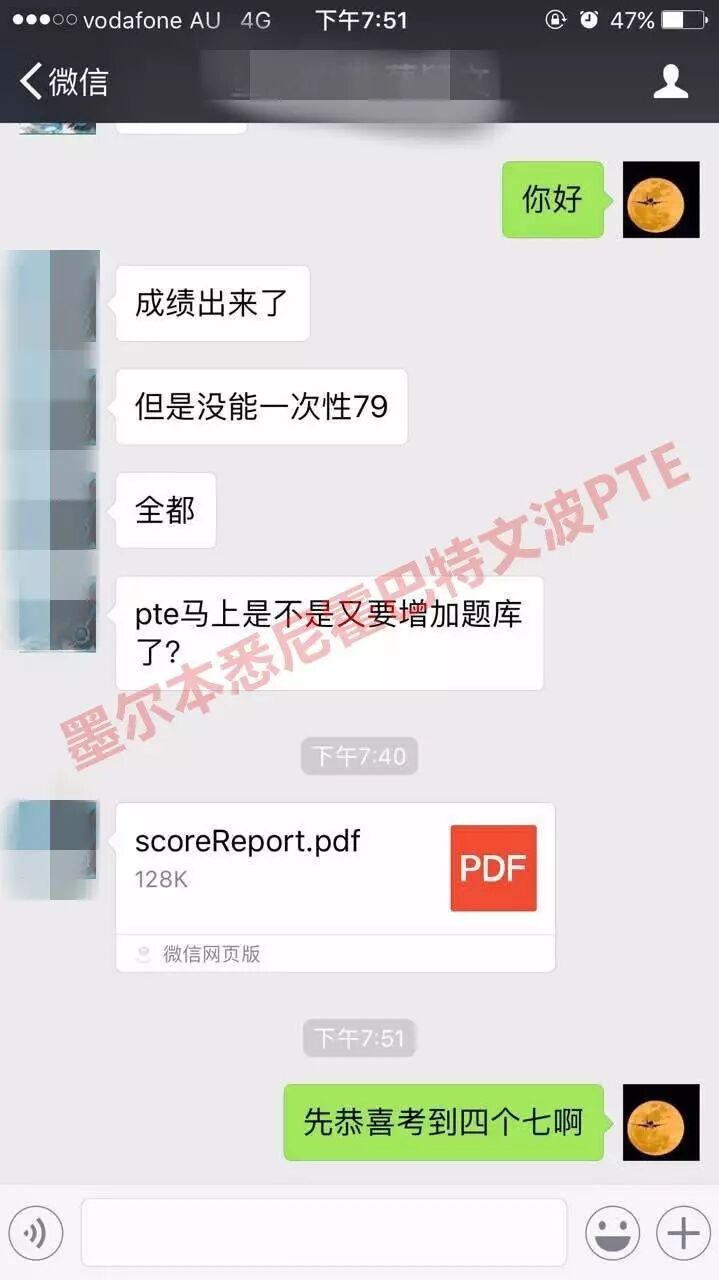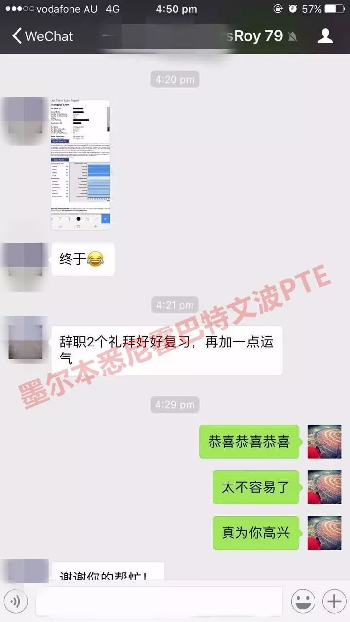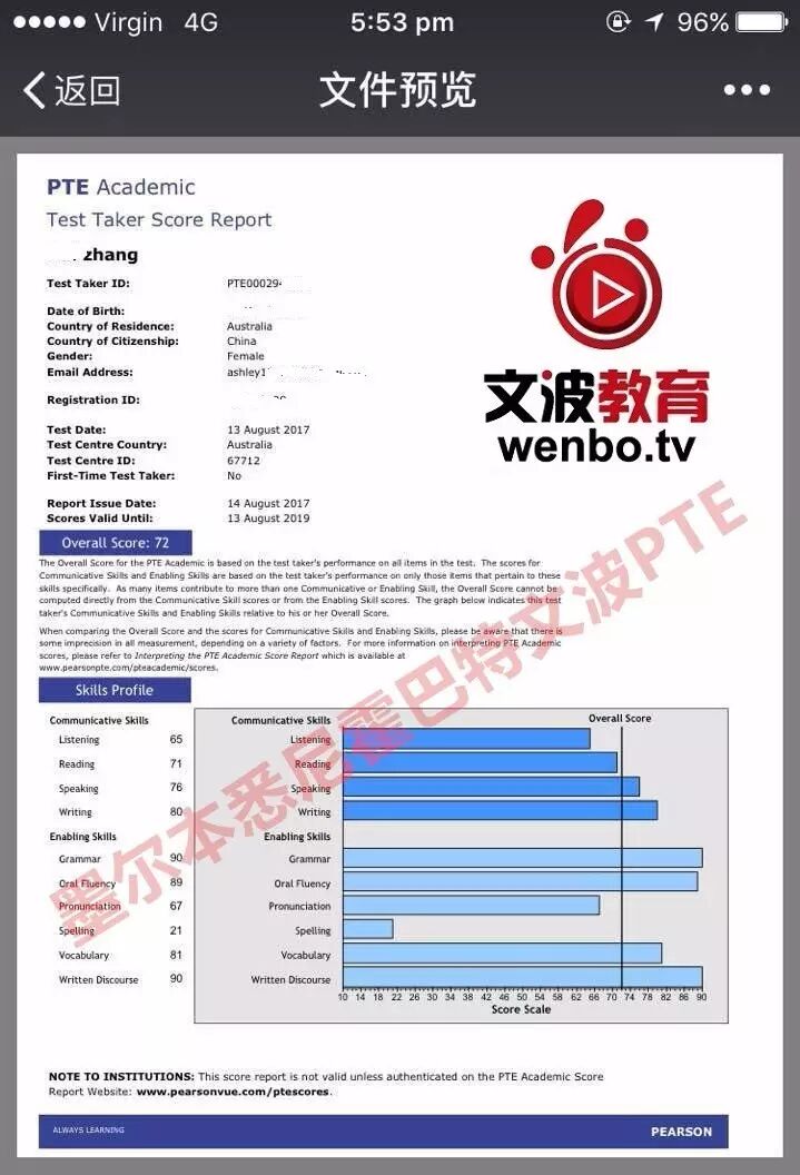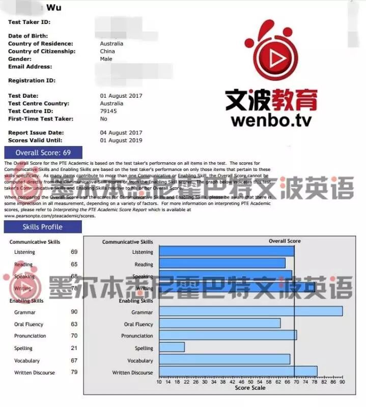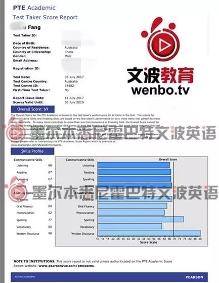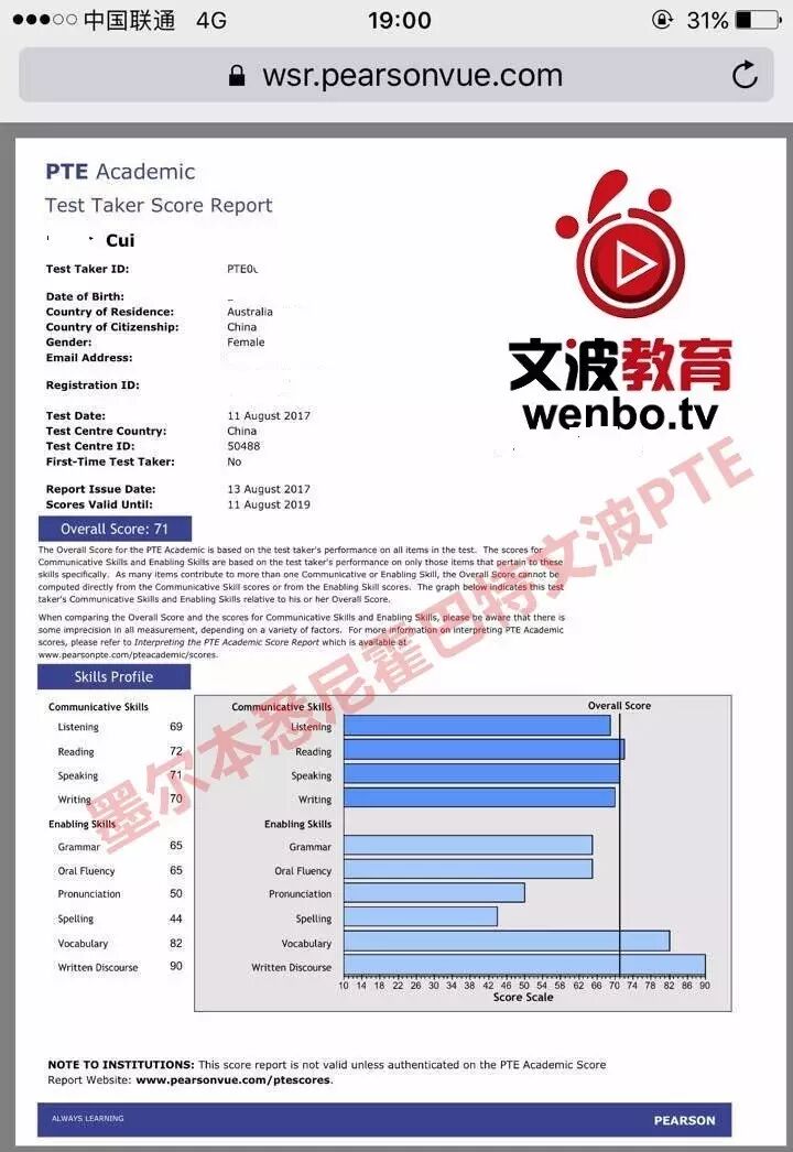 喜墨尔本悉尼文波PTE学员Youie获得听力69,阅读65,口语68,写作78,总分69分的好成绩!也是八月文波PTE第41位通过四个七四个八的学员.