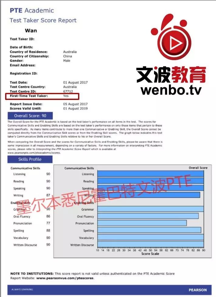 恭喜墨尔本悉尼文波PTE学员Eric获得听力90,阅读90,口语90,写作87,总分90分的好成绩!也是八月文波PTE第48位通过四个七四个八的学员.