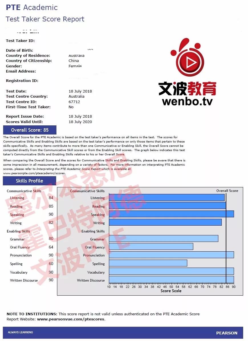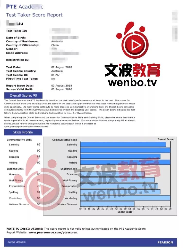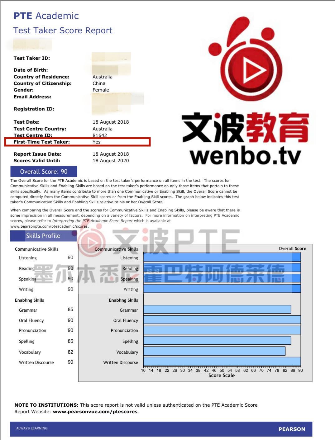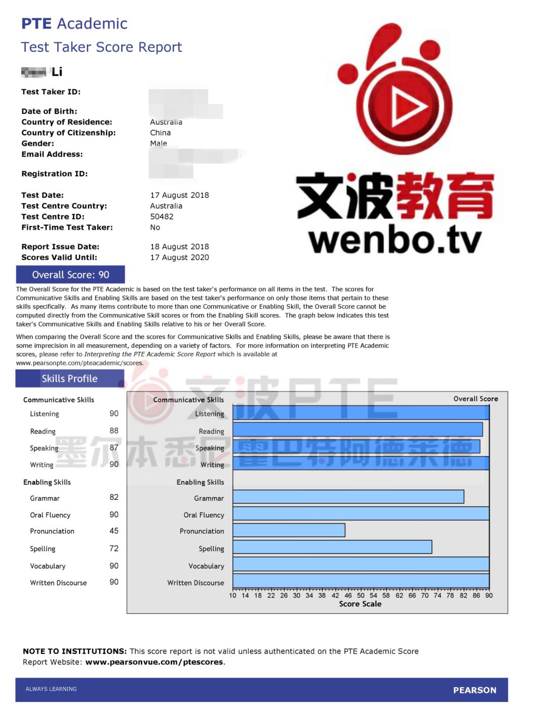 恭喜墨尔本悉尼霍巴特阿德莱德文波PTE学员Li同学获得听力90,阅读88,口语87,写作90,总分90的好成绩!也是8月文波PTE第58位通过四个七四个八的学员