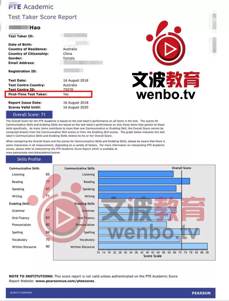 恭喜墨尔本悉尼霍巴特阿德莱德文波PTE学员Hao同学获得听力65,阅读77,口语67,写作71,总分71的好成绩!也是8月文波PTE第60位通过四个七四个八的学员