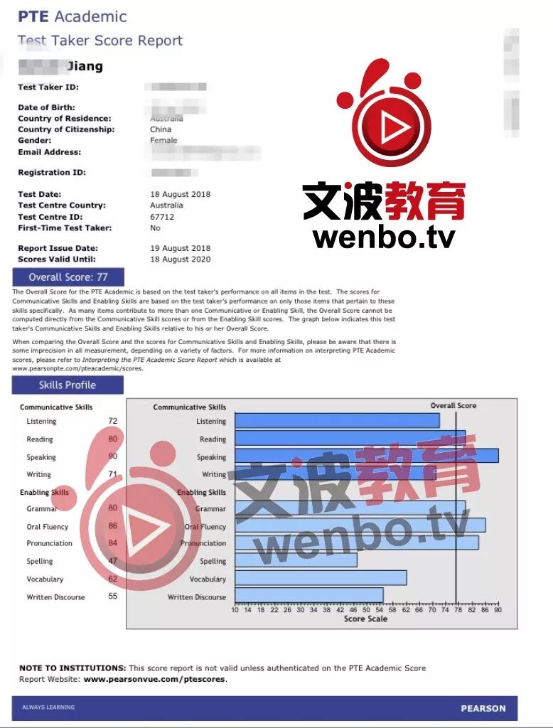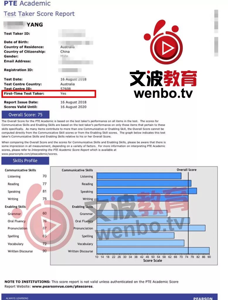 恭喜墨尔本悉尼霍巴特阿德莱德文波PTE学员Yang同学获得听力70,阅读77,口语81,写作75,总分75的好成绩!也是8月文波PTE第54位通过四个七四个八的学员