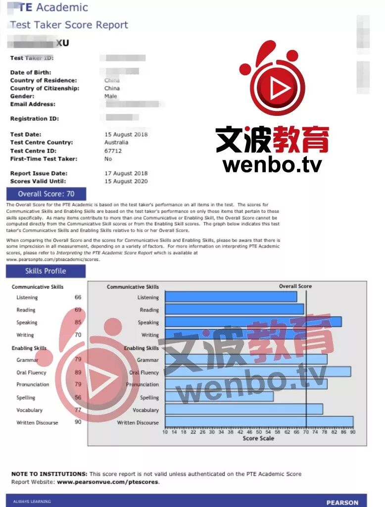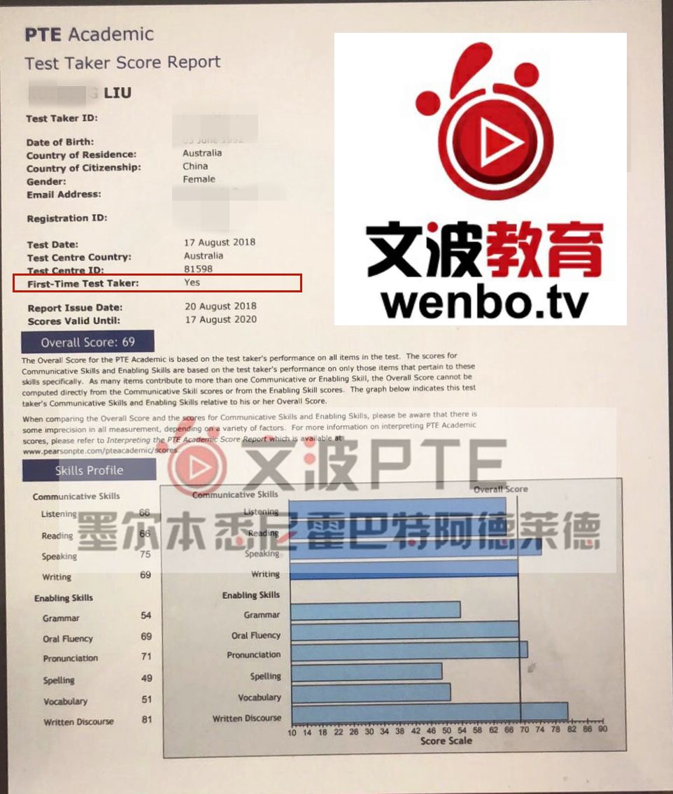 恭喜墨尔本悉尼霍巴特阿德莱德文波PTE学员Liu同学获得听力66,阅读66,口语75,写作69,总分69的好成绩!也是8月文波PTE第59位通过四个七四个八的学员