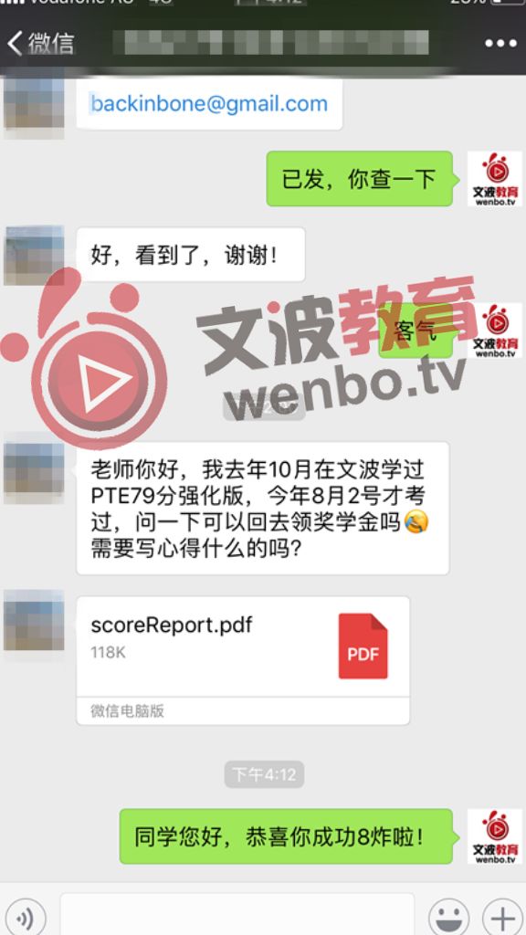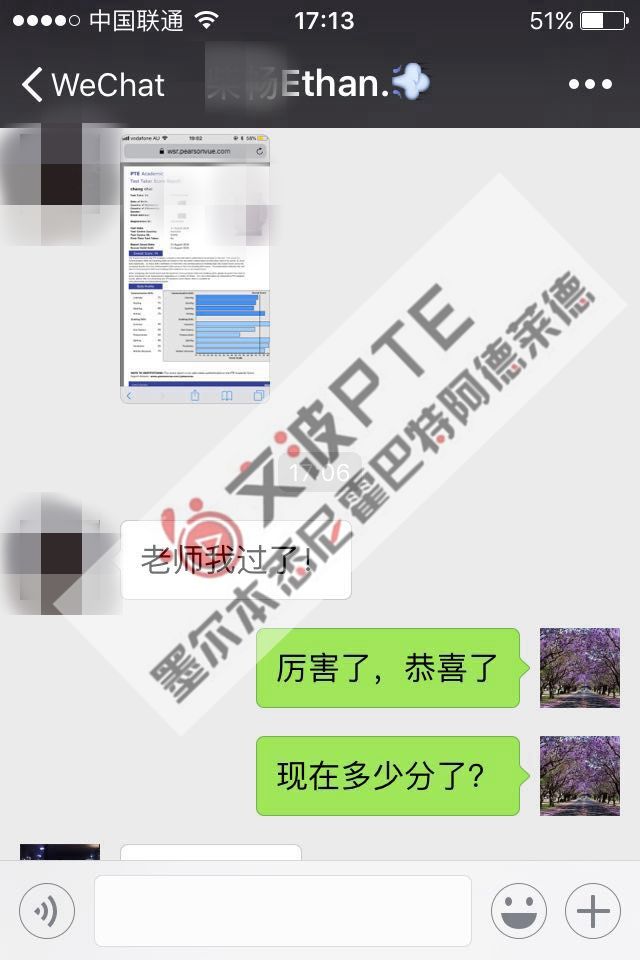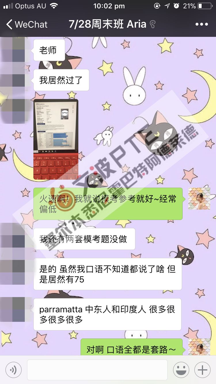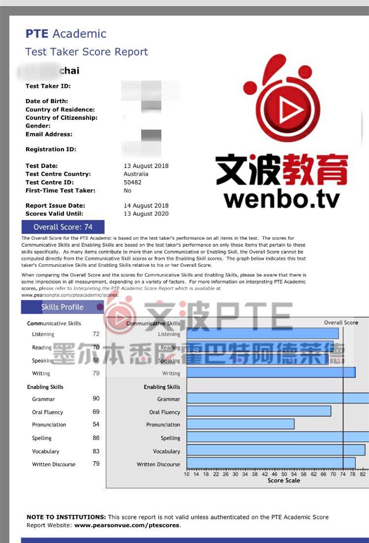恭喜墨尔本悉尼霍巴特阿德莱德文波PTE学员Chai同学获得听力72,阅读70,口语68,写作79,总分74的好成绩!也是8月文波PTE第55位通过四个七四个八的学员