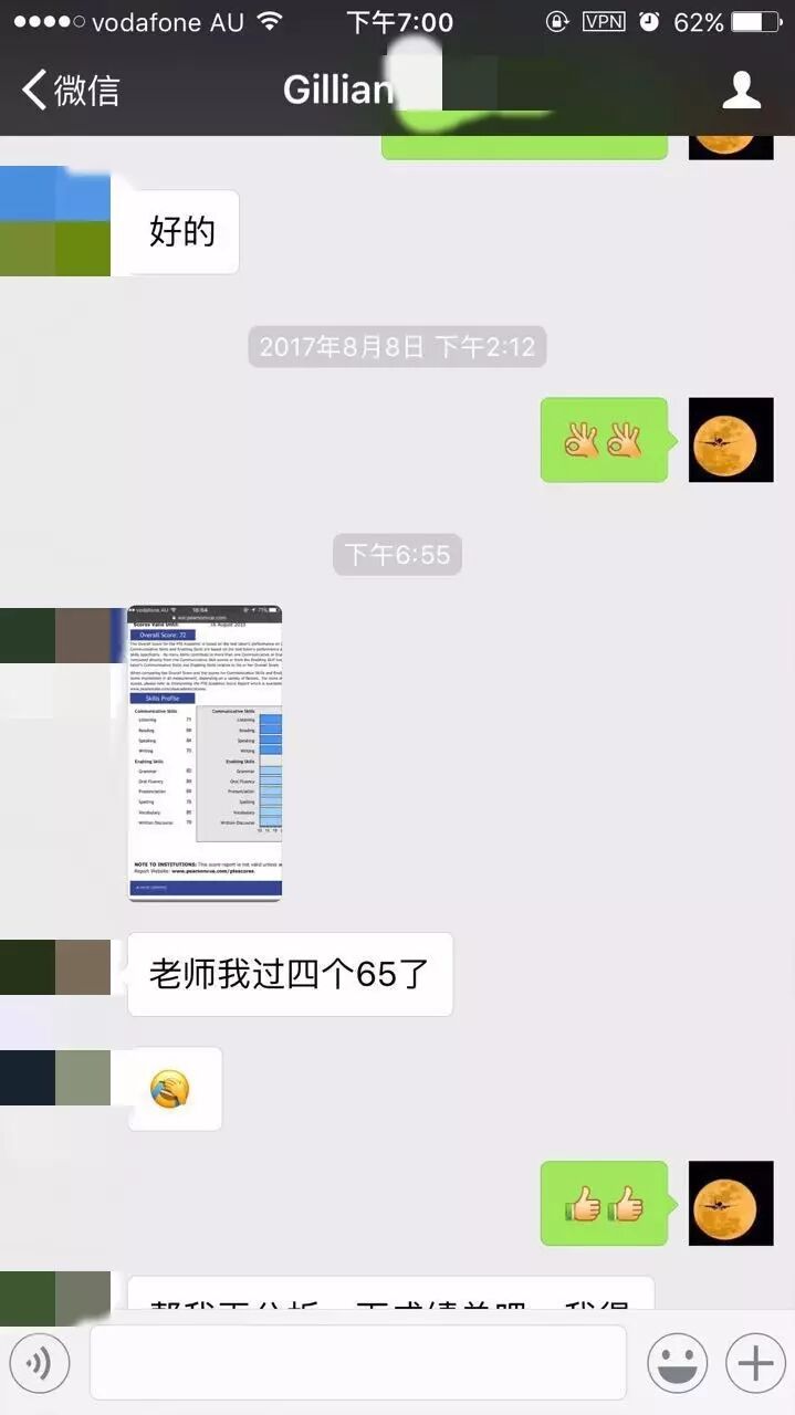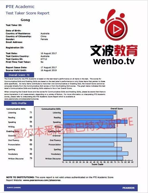 恭喜墨尔本悉尼文波PTE学员Gillian获得听力71,阅读68,口语84,写作70,总分72分的好成绩!也是八月文波PTE第73位通过四个七四个八的学员.