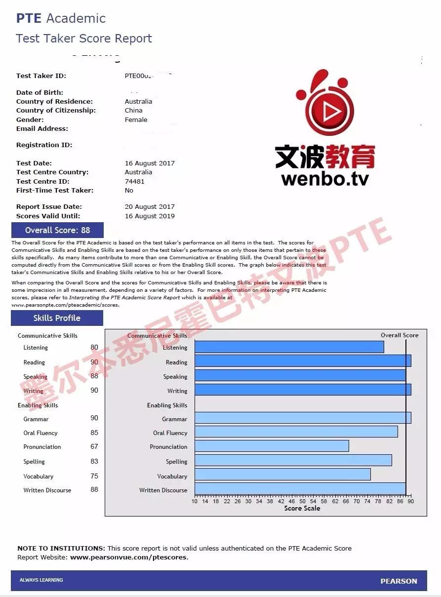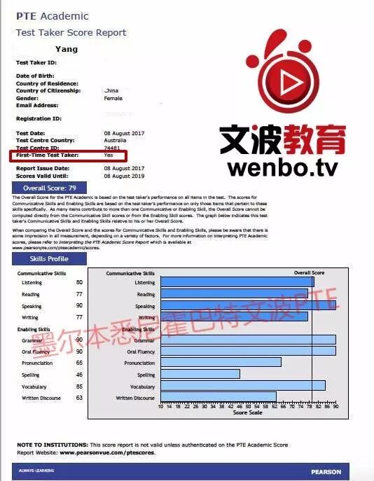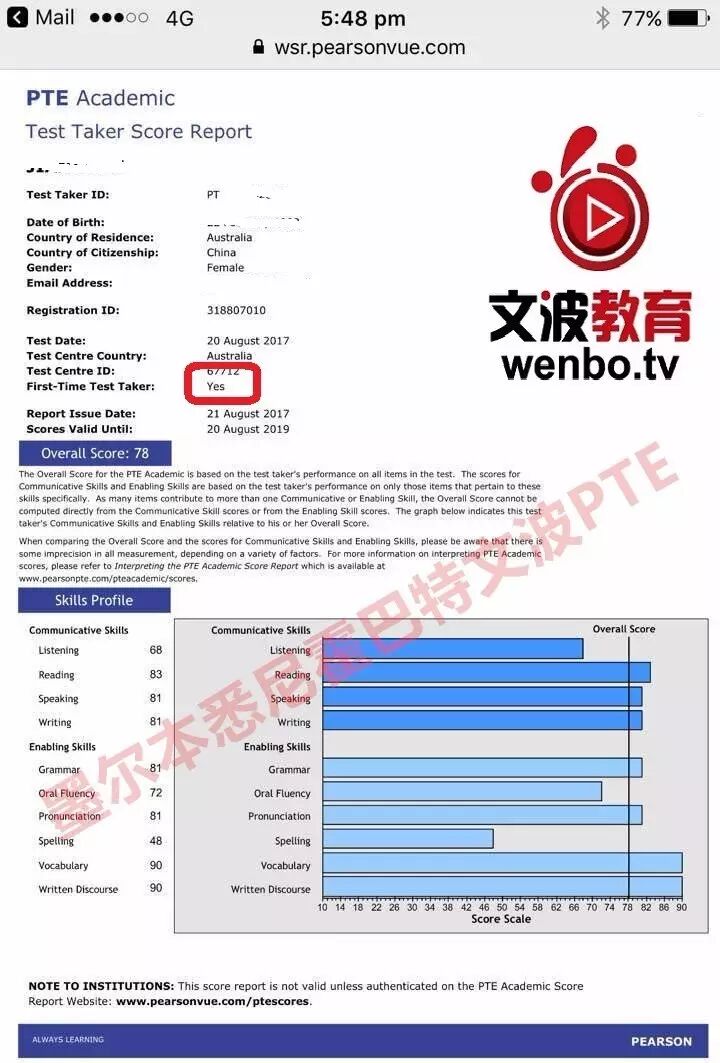 恭喜墨尔本悉尼文波PTE学员Yang获得听力80,阅读77,口语90,写作77,总分79分的好成绩!也是八月文波PTE第71位通过四个七四个八的学员.