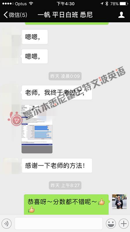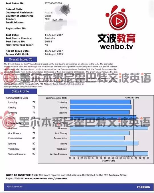 恭喜墨尔本悉尼文波PTE学员YiFan获得听力72,阅读73,口语71,写作78,总分75分的好成绩!也是八月文波PTE第72位通过四个七四个八的学员.