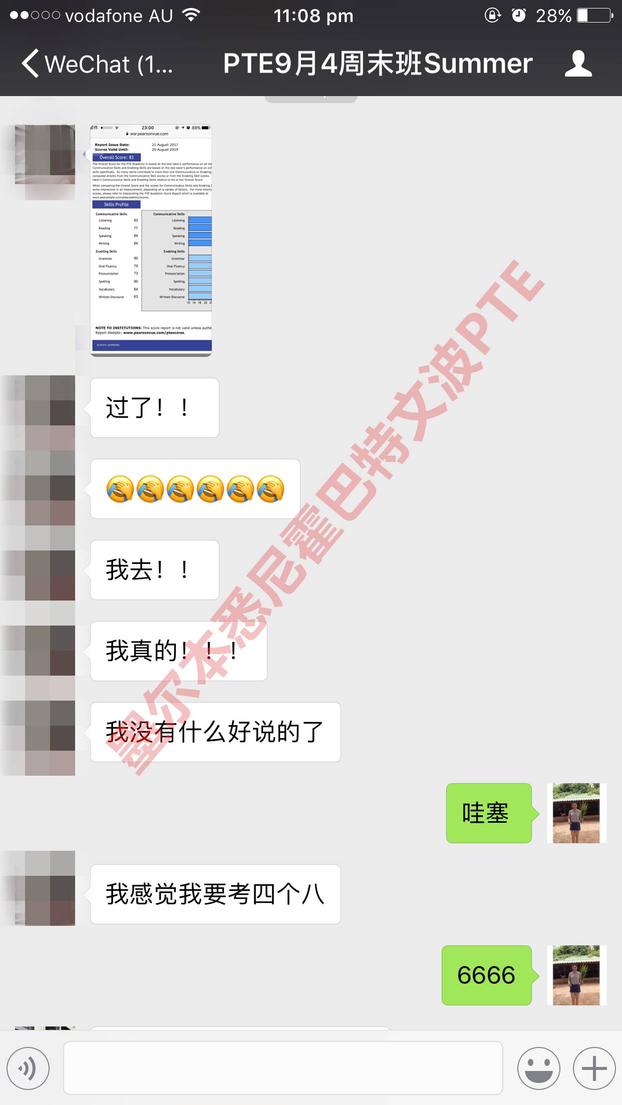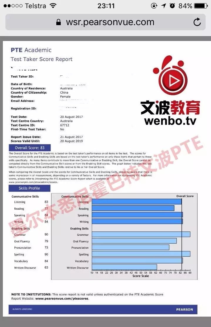 恭喜墨尔本悉尼文波PTE学员Summer获得听力83,阅读77,口语84,写作84,总分83分的好成绩!也是八月文波PTE第78位通过四个七四个八的学员.