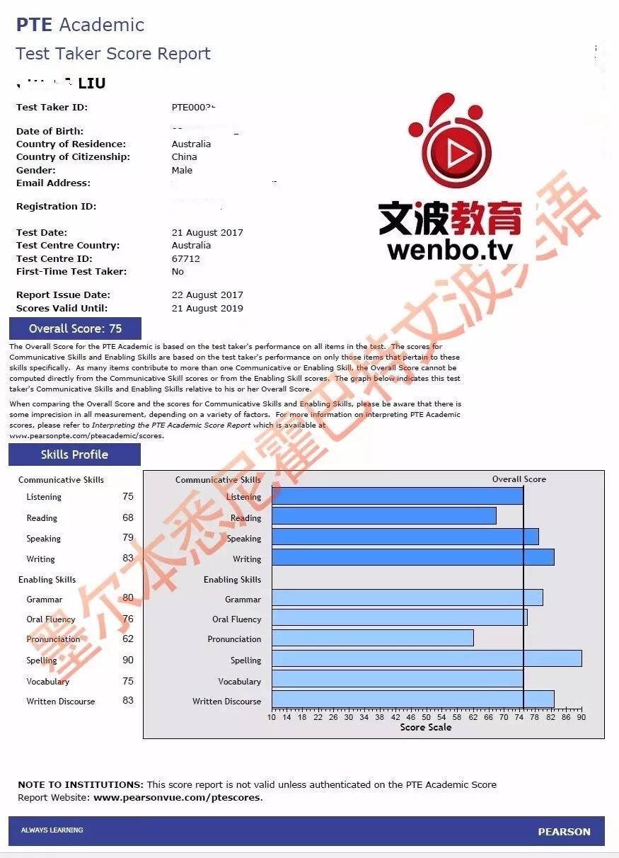 恭喜墨尔本悉尼文波PTE学员Kelvin获得听力75,阅读68,口语79,写作83,总分75分的好成绩!也是八月文波PTE第79位通过四个七四个八的学员.