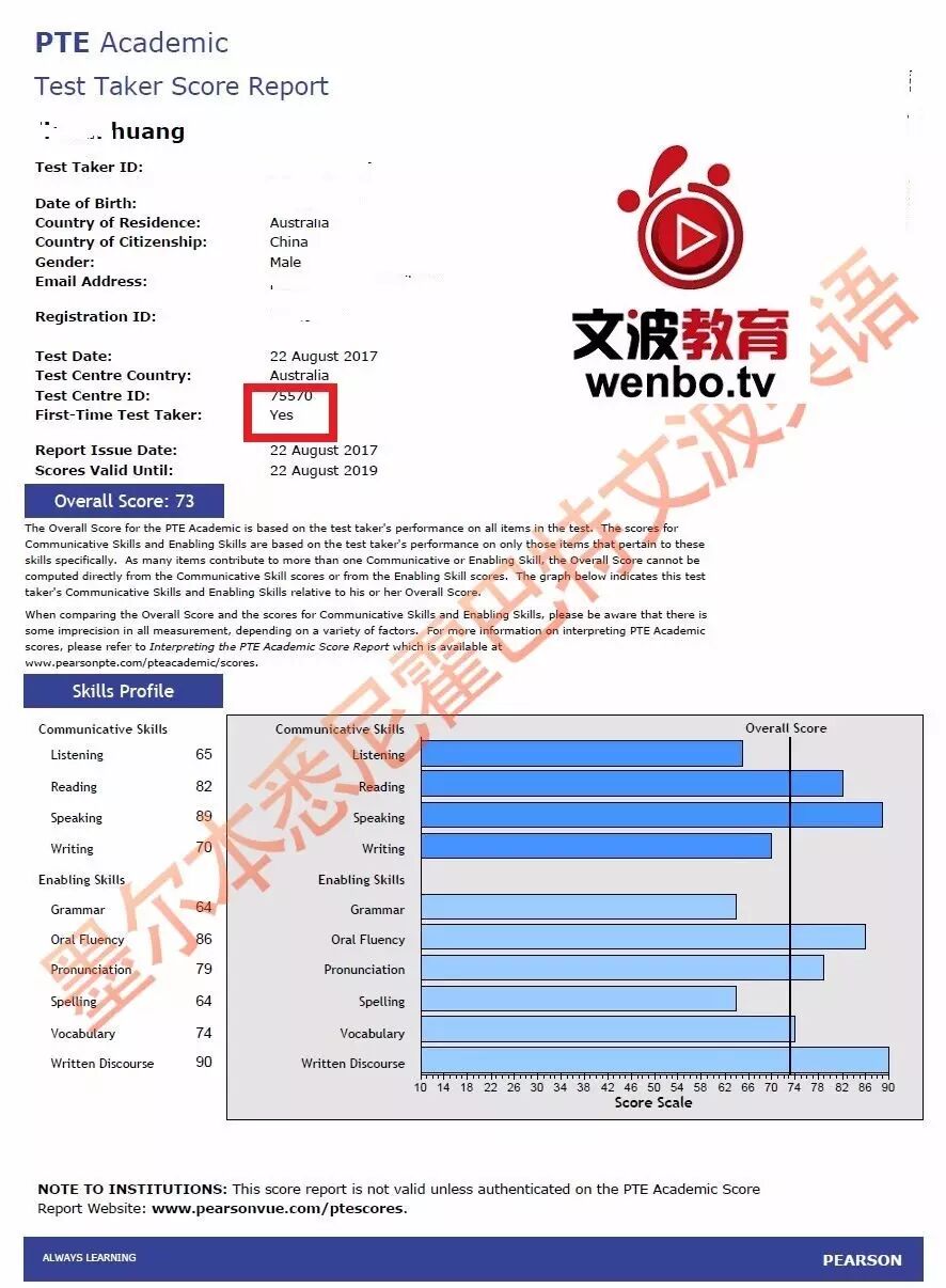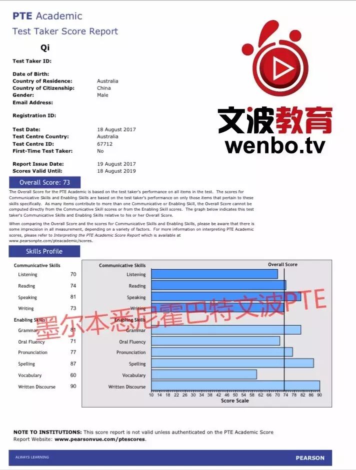 恭喜墨尔本悉尼文波PTE学员Jeffery获得听力70,阅读74,口语81,写作73,总分73分的好成绩!也是八月文波PTE第74位通过四个七四个八的学员.