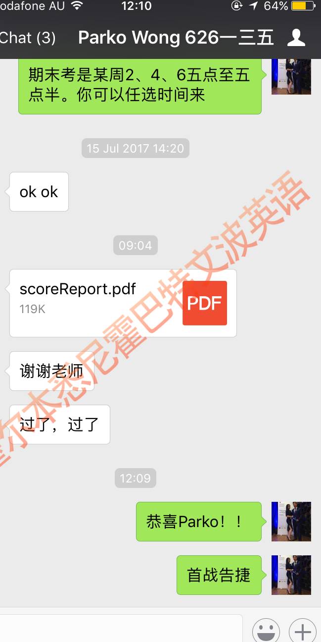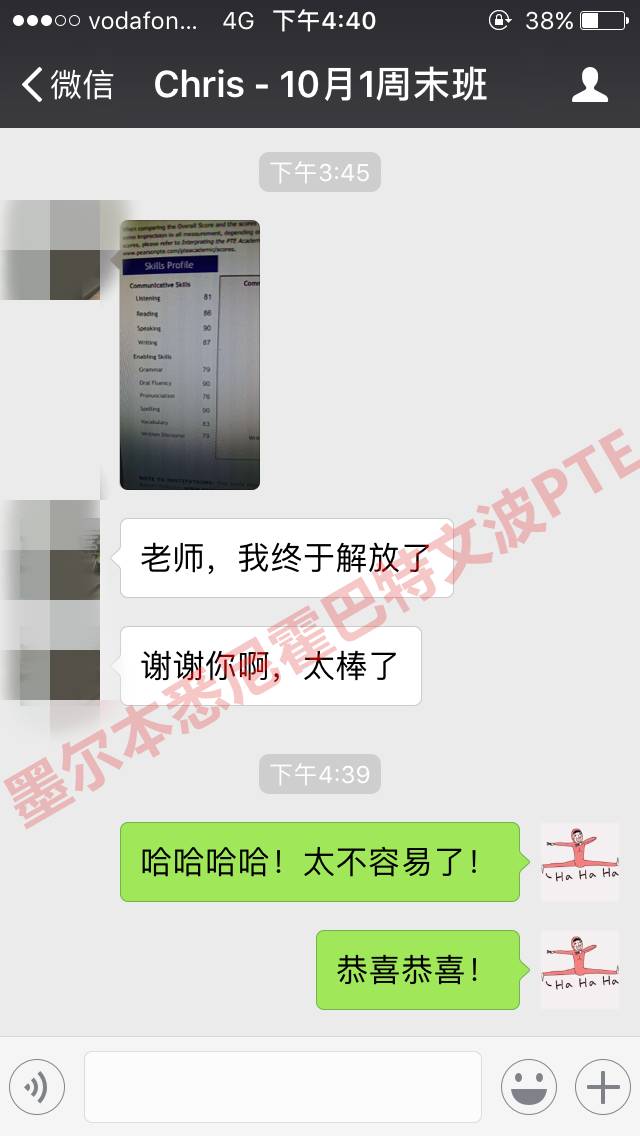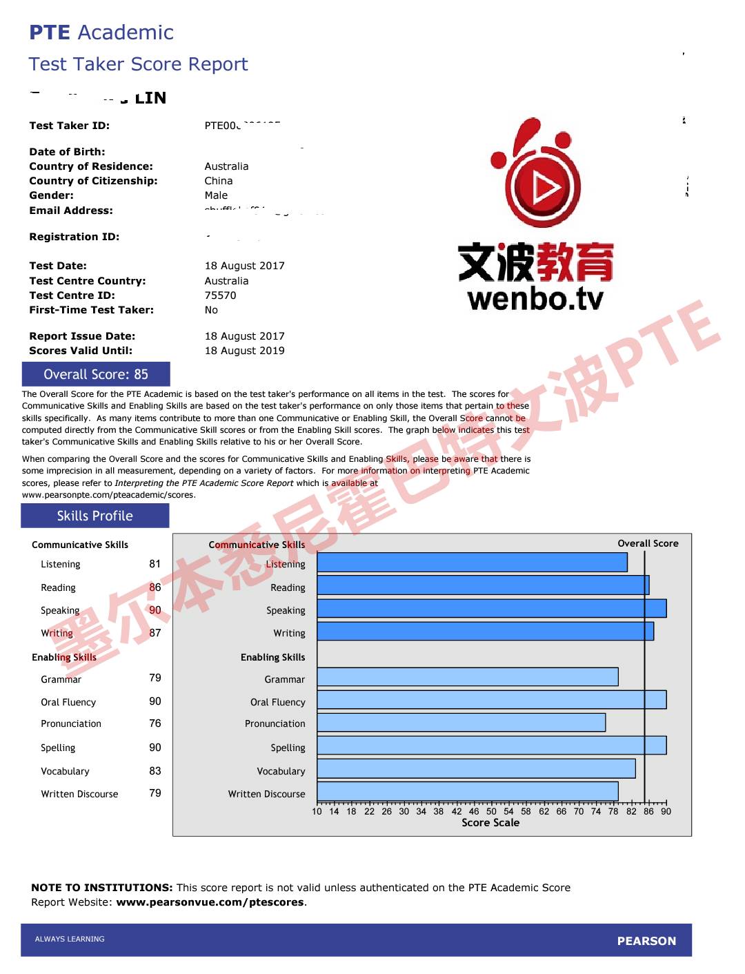 恭喜墨尔本悉尼文波PTE学员Chris获得听力81,阅读86,口语90,写作87,总分85分的好成绩!也是八月文波PTE第75位通过四个七四个八的学员.