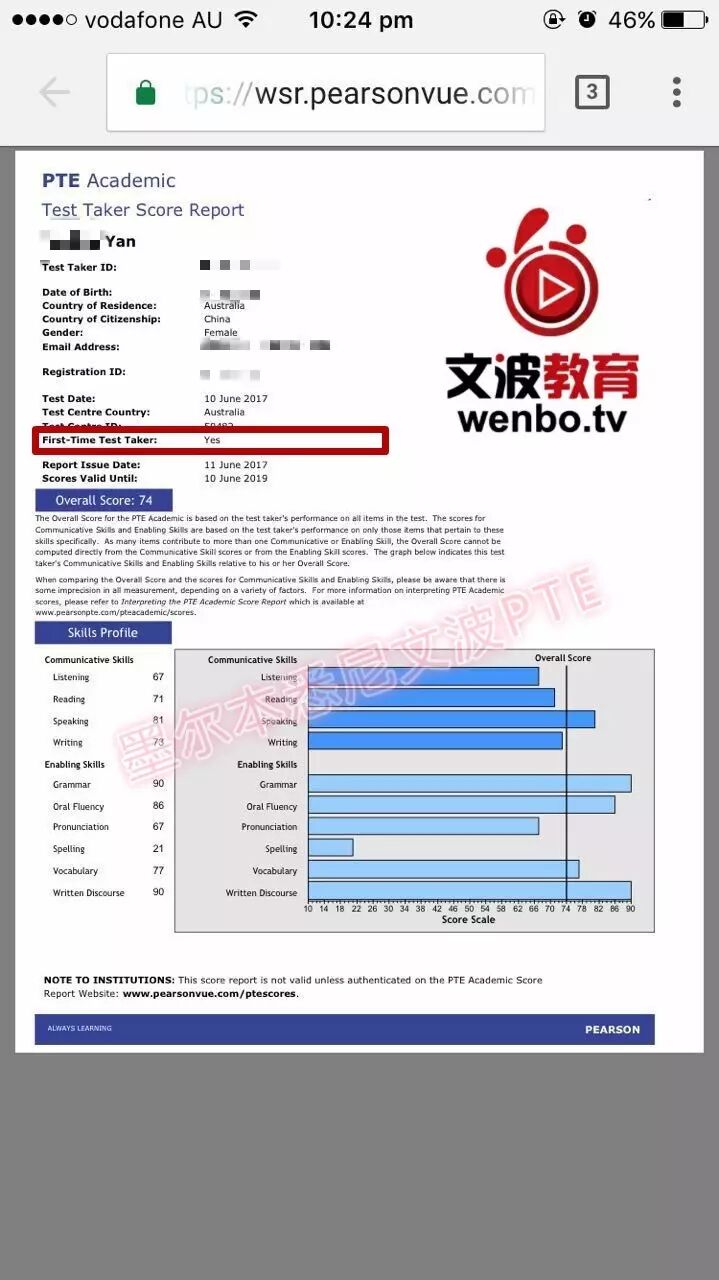 恭喜墨尔本悉尼文波PTE学员Yin获得听力77,阅读72,口语74,写作88,总分78分的好成绩!也是六月文波PTE第25位通过四个七四个八的学员.