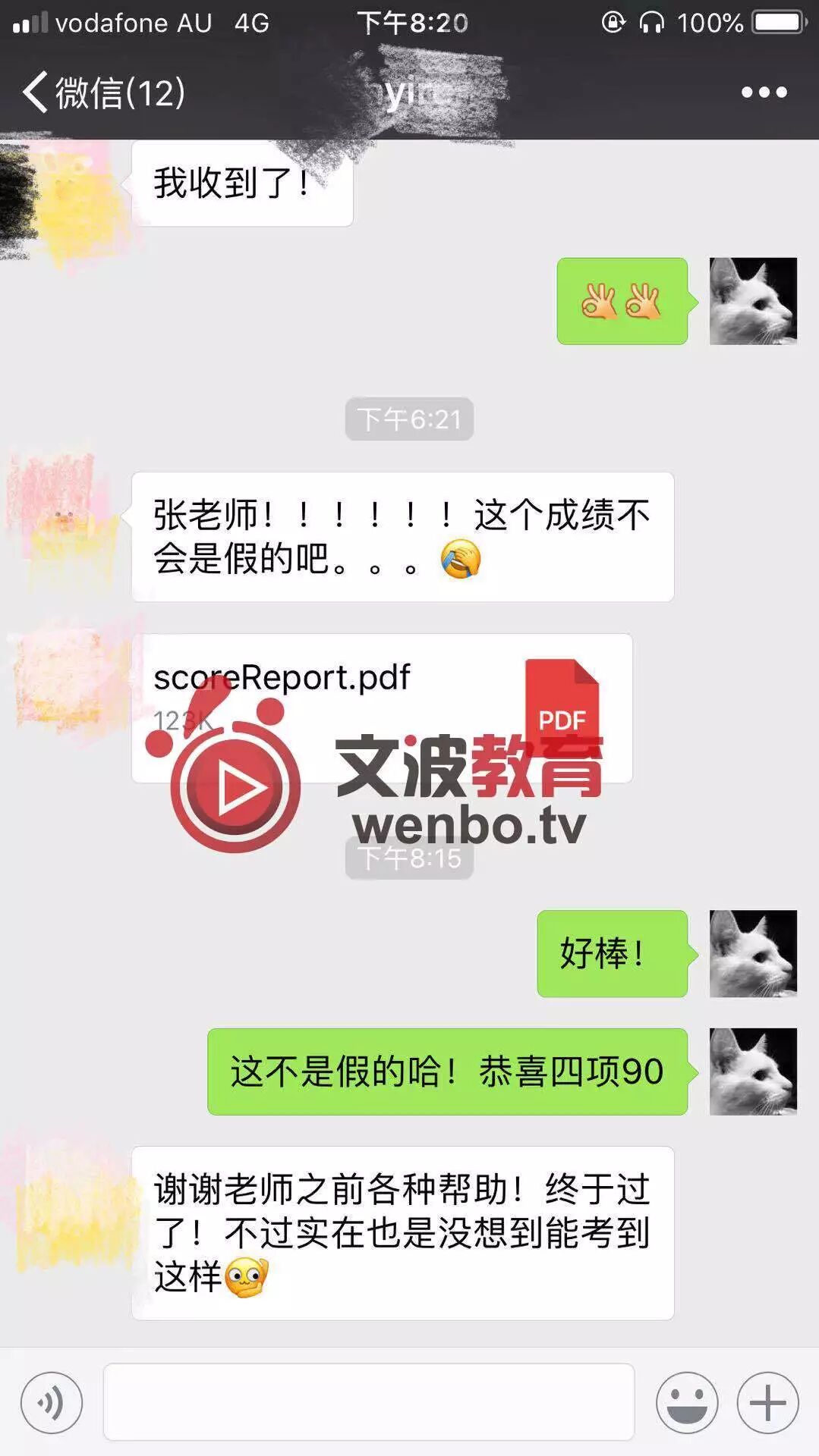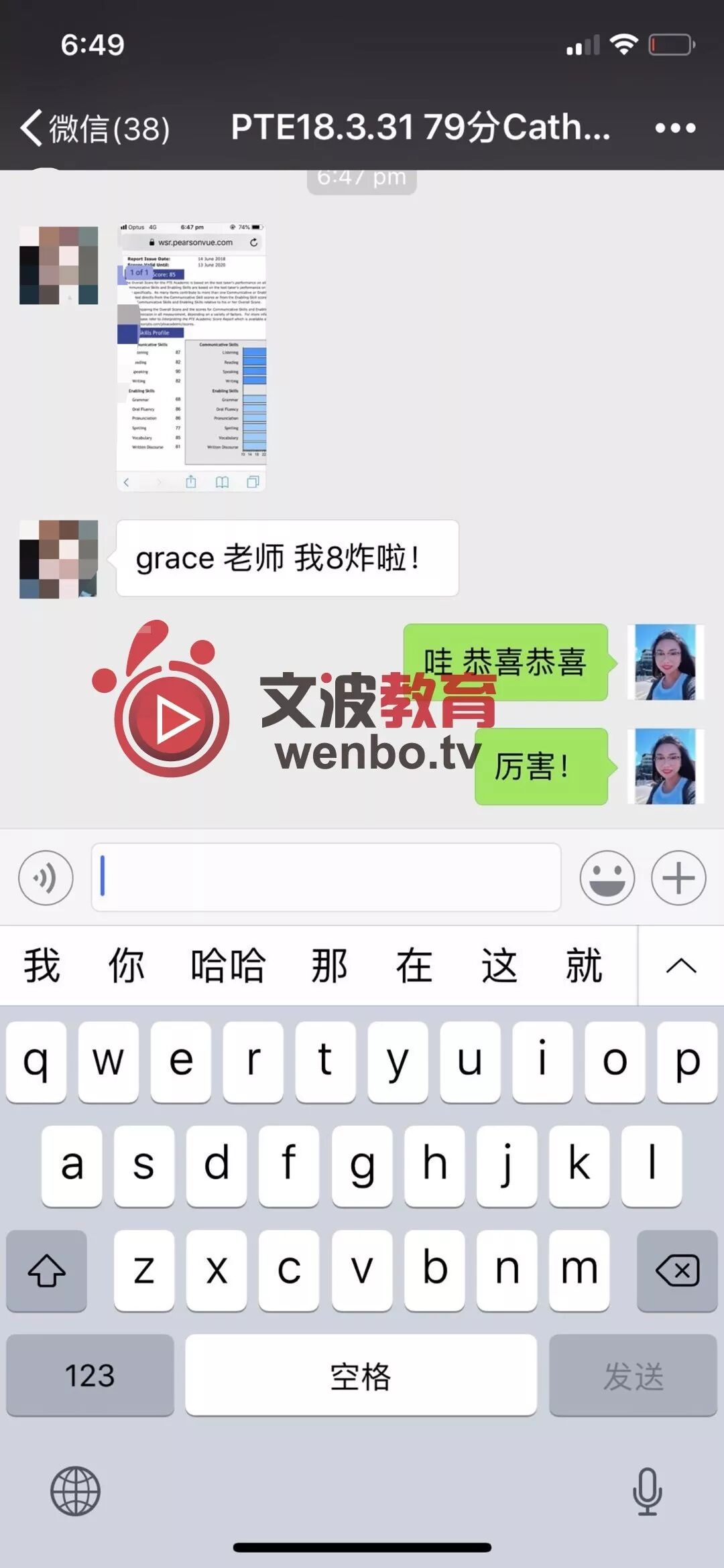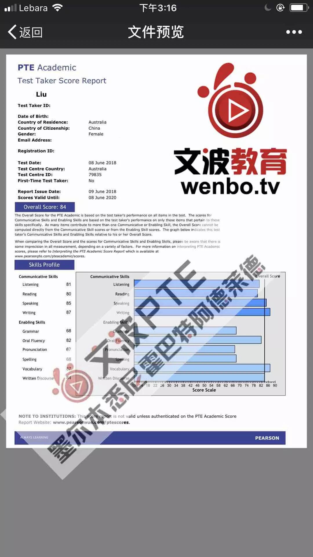 8炸!恭喜墨尔本悉尼霍巴特阿德莱德文波PTE学员Liu同学获得听力81,阅读80,口语85,写作87,总分84分的好成绩!也是六月文波PTE第31位通过四个七四个八的学员。