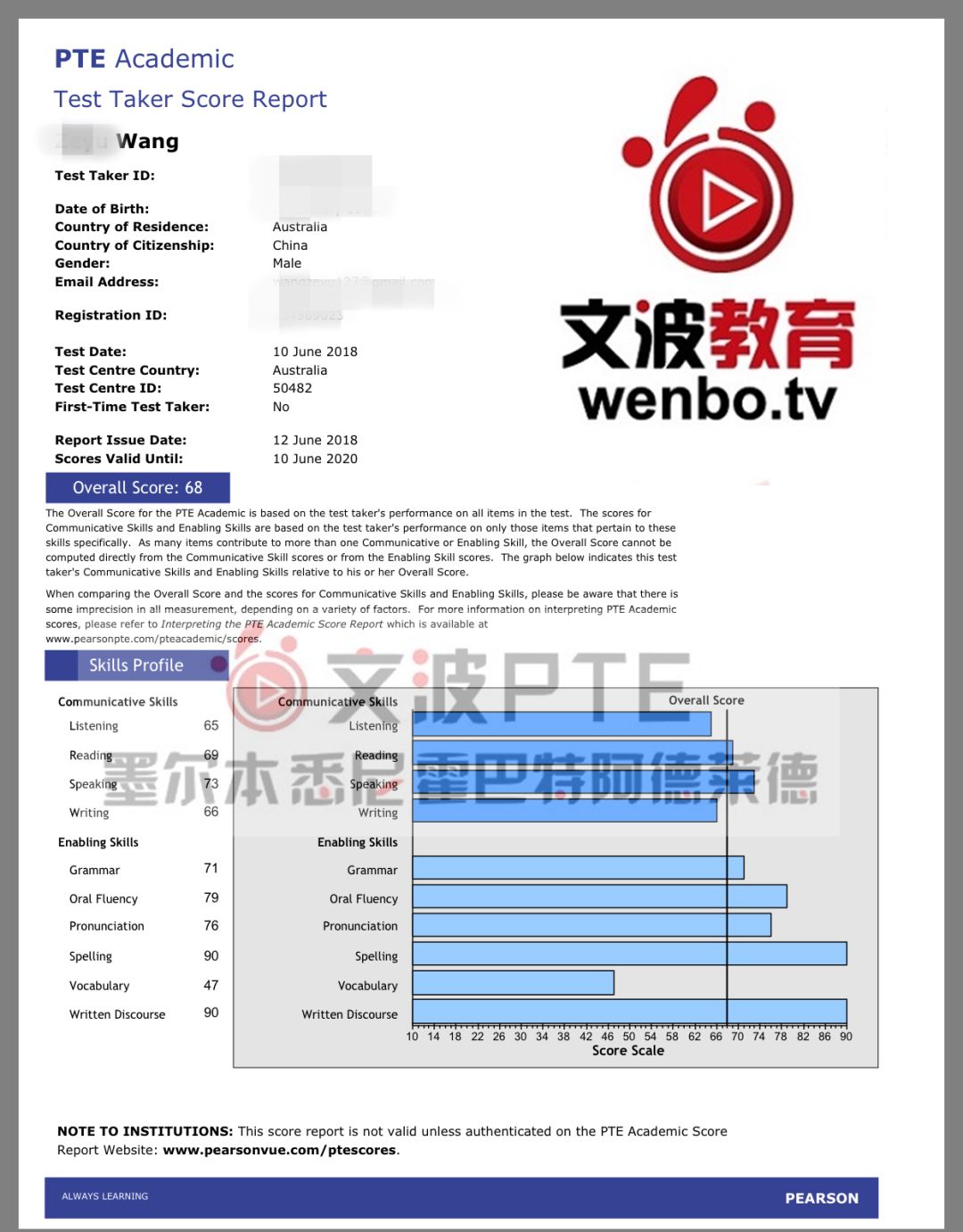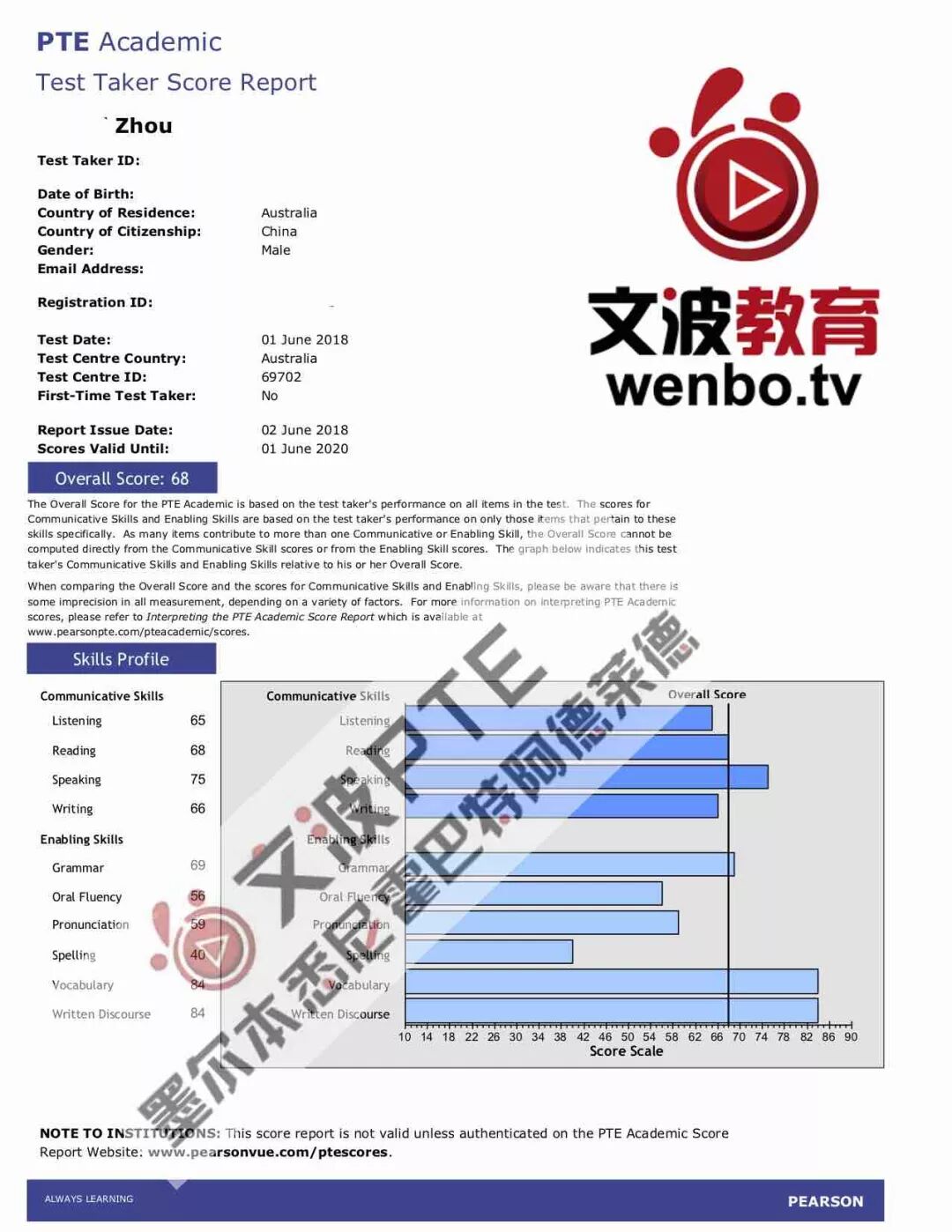 恭喜墨尔本悉尼霍巴特阿德莱德文波PTE学员Zhou同学获得听力65,阅读68,口语75,写作66,总分68分的好成绩!也是六月文波PTE第32位通过四个七四个八的学员。