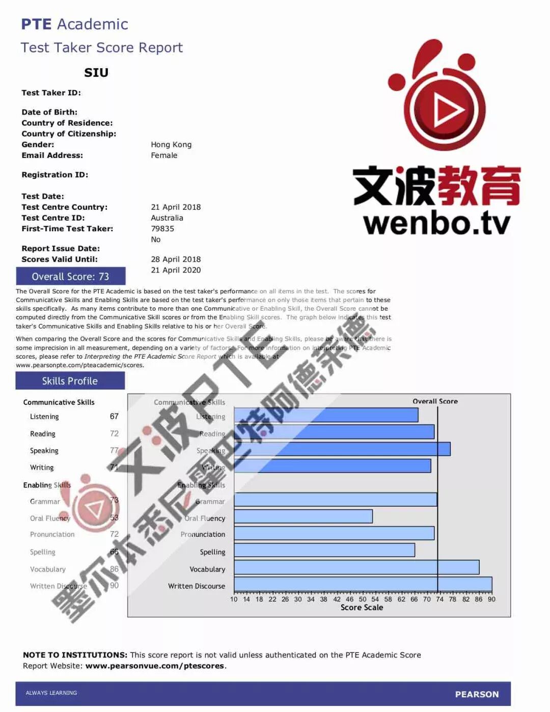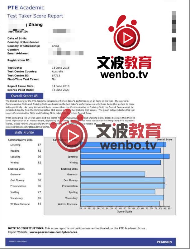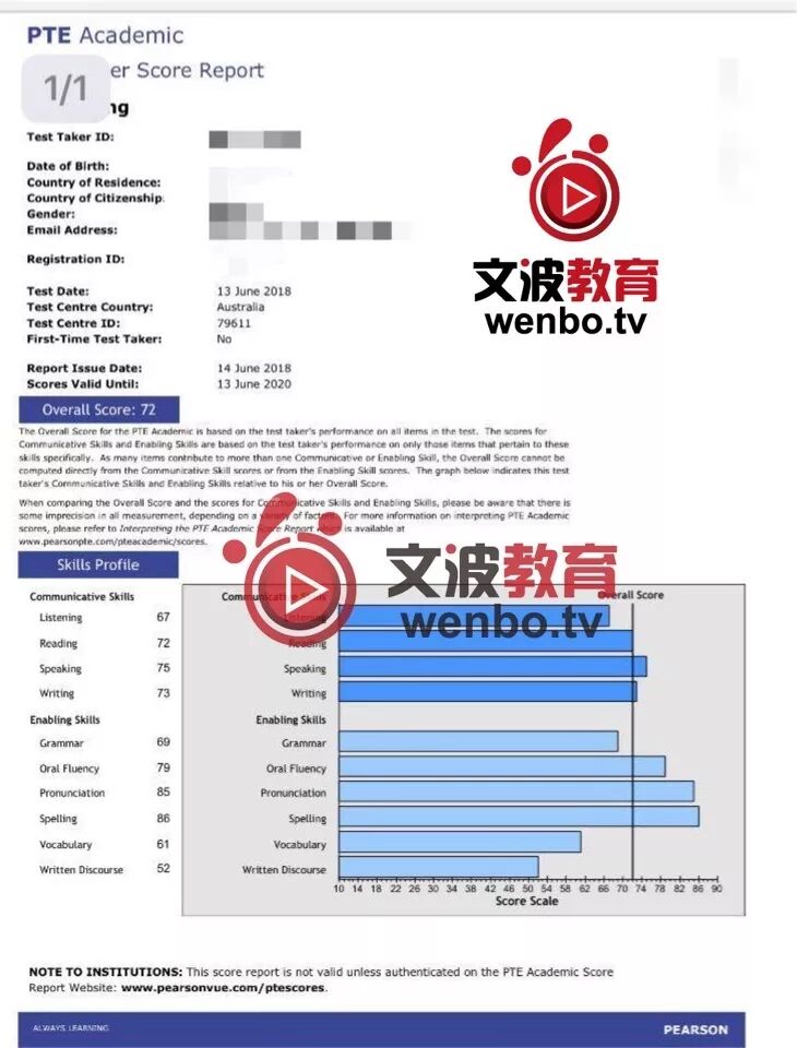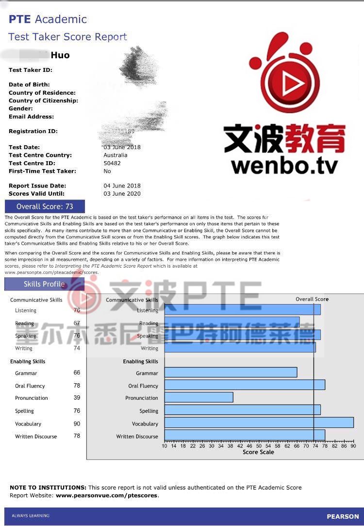 恭喜墨尔本悉尼霍巴特阿德莱德文波PTE学员Siu同学获得听力67,阅读72,口语77,写作71,总分73分的好成绩!也是六月文波PTE第33位通过四个七四个八的学员。