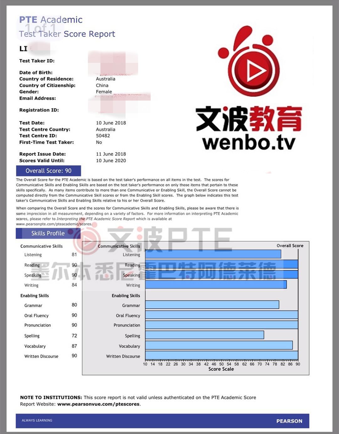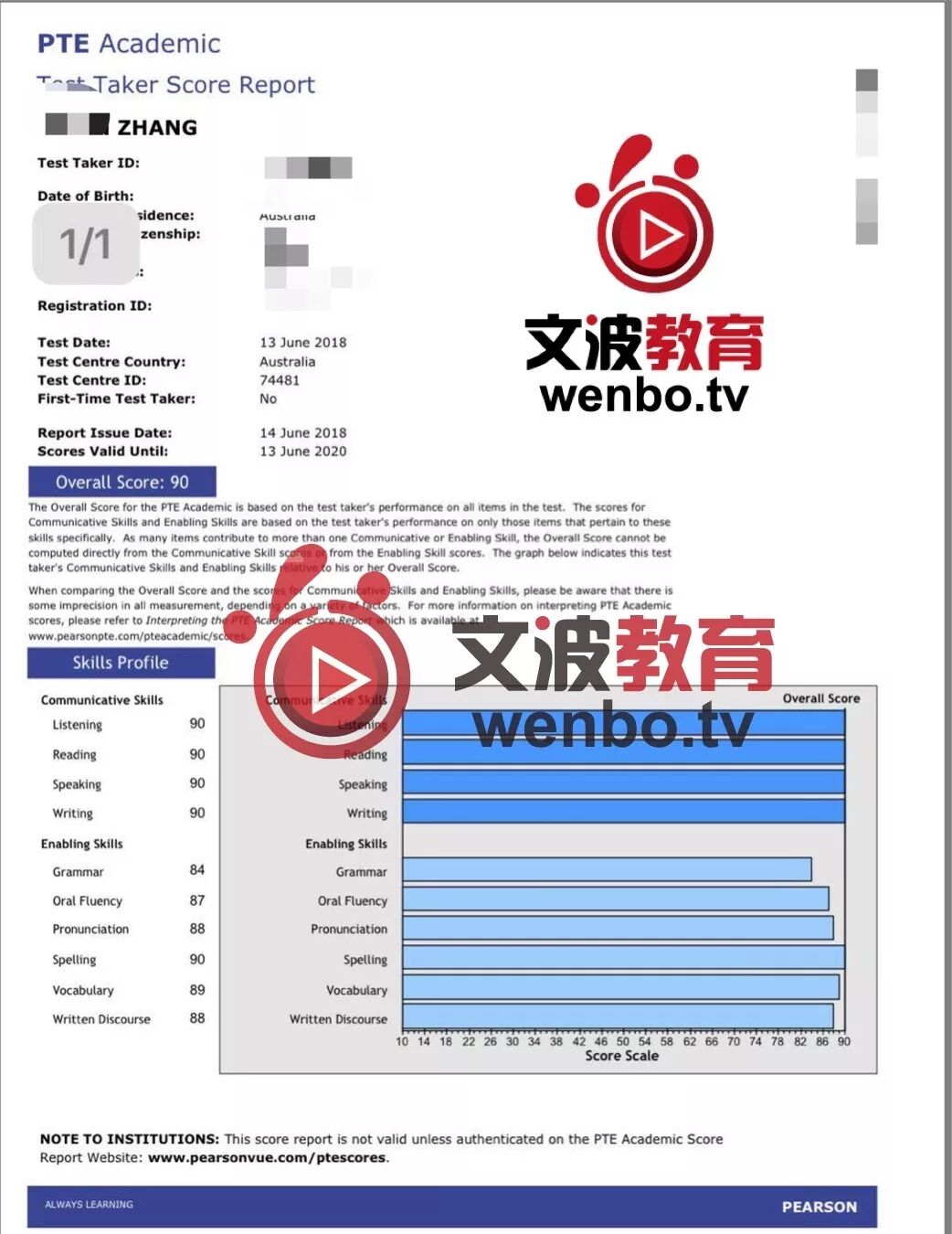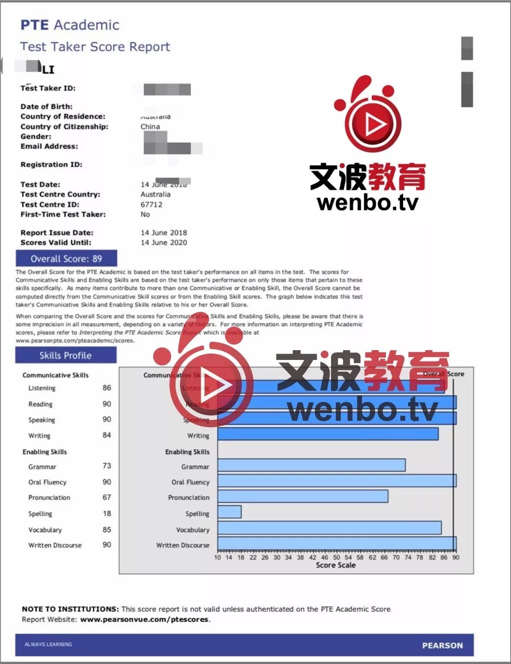 恭喜墨尔本悉尼霍巴特阿德莱德文波PTE学员Siu同学获得听力67,阅读72,口语77,写作71,总分73分的好成绩!也是六月文波PTE第33位通过四个七四个八的学员。