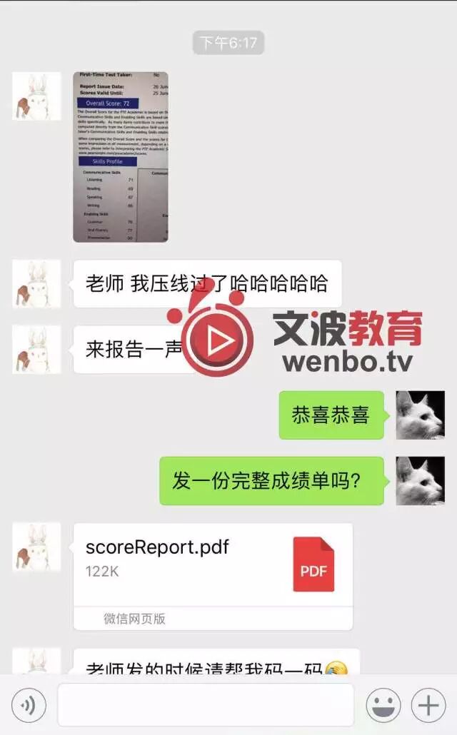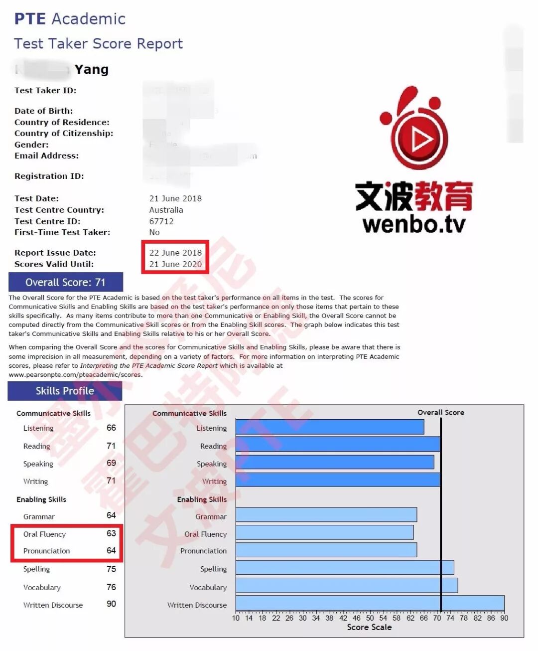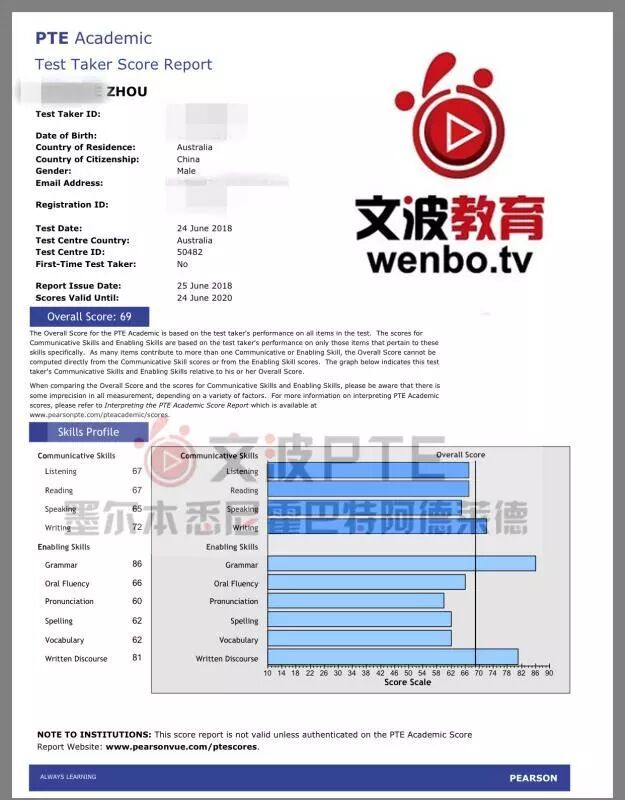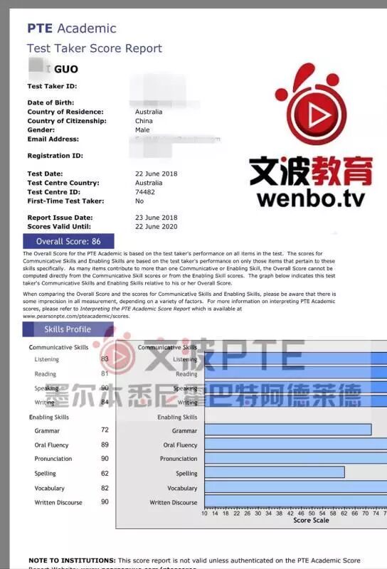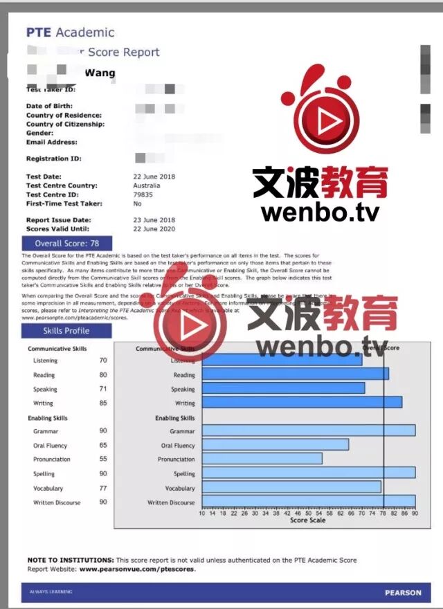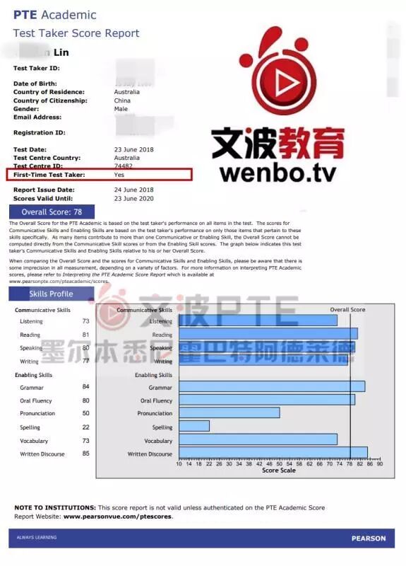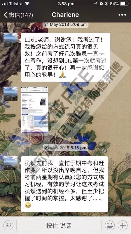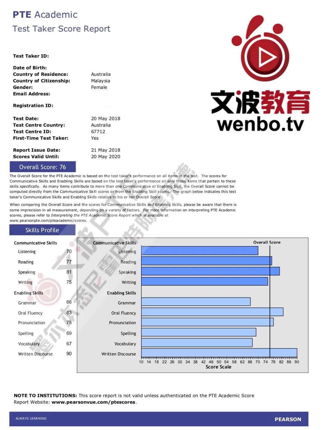 恭喜墨尔本悉尼霍巴特阿德莱德文波PTE学员Charlene同学获得听力70,阅读77,口语81,写作75,总分76分的好成绩!也是六月文波PTE第64位通过四个七四个八的学员。