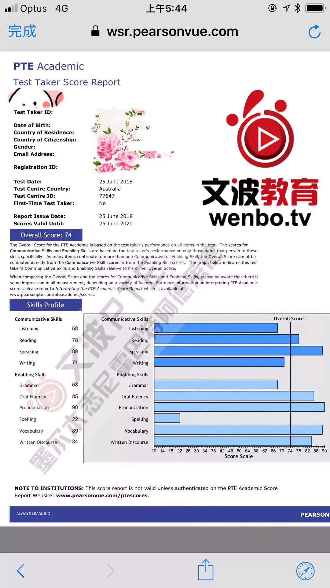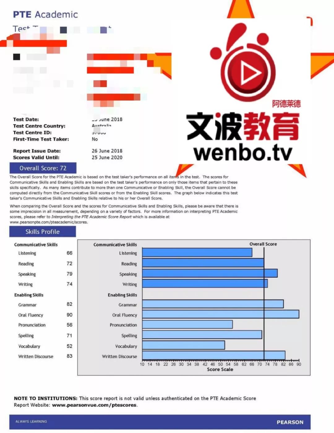 恭喜墨尔本悉尼霍巴特阿德莱德文波PTE学员Tracey同学获得听力68,阅读78,口语89,写作71,总分74分的好成绩!也是六月文波PTE第63位通过四个七四个八的学员。