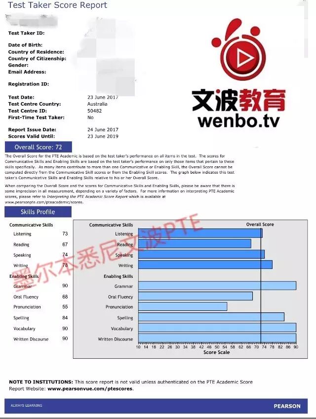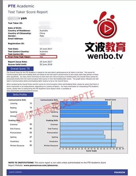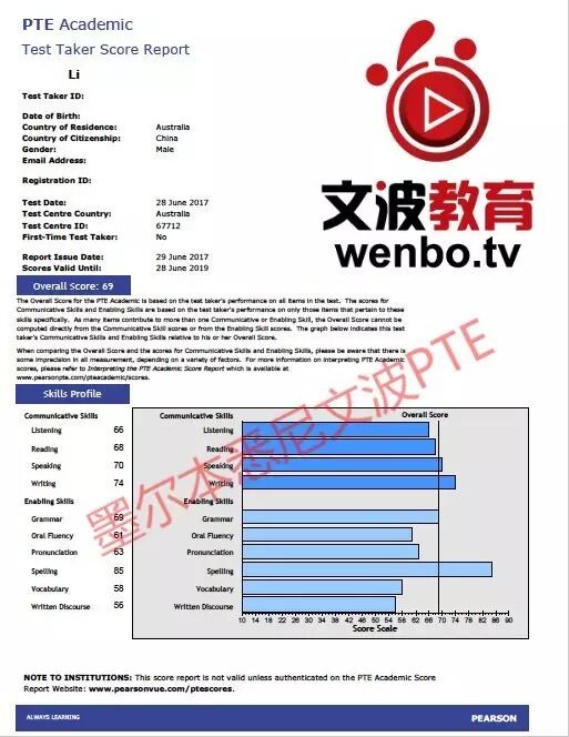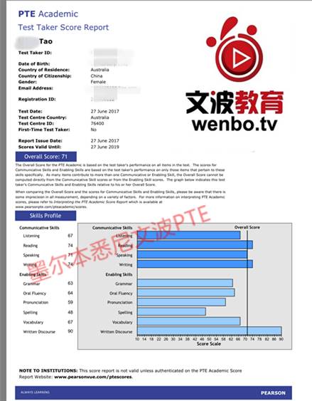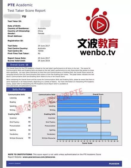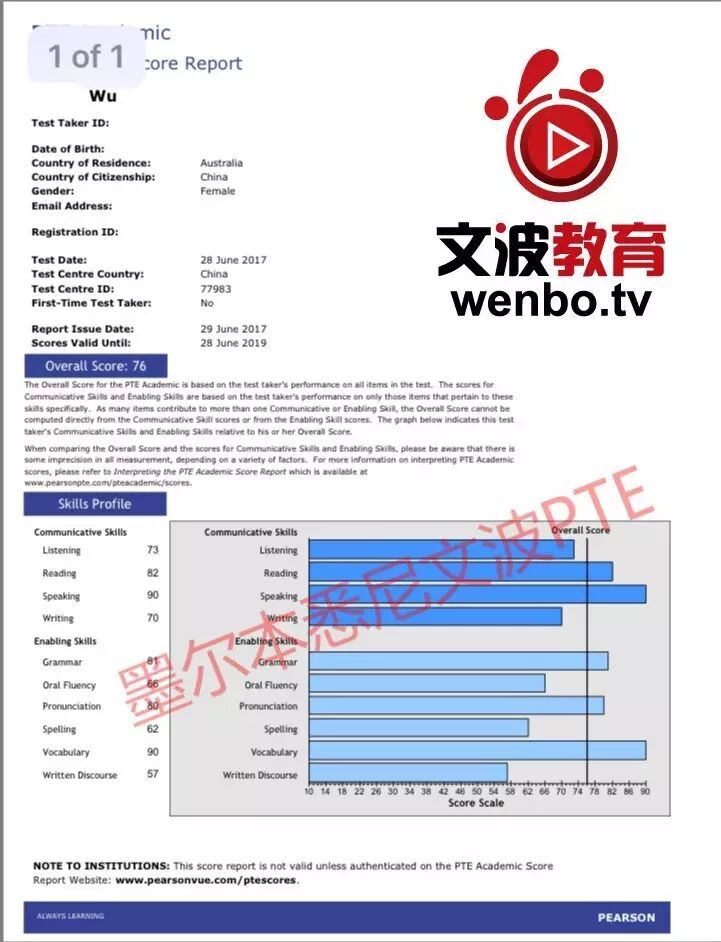 恭喜墨尔本悉尼文波PTE学员Yu获得听力65,阅读65,口语79,写作65,总分68分的好成绩!也是六月文波PTE第83位通过四个七四个八的学员.